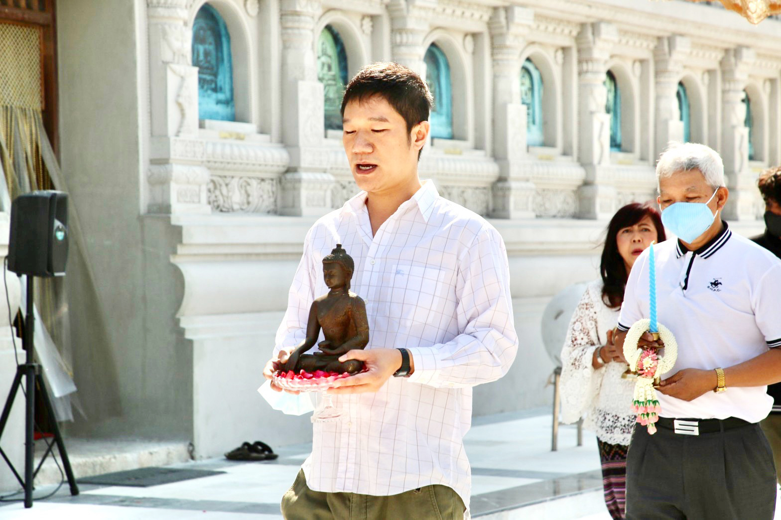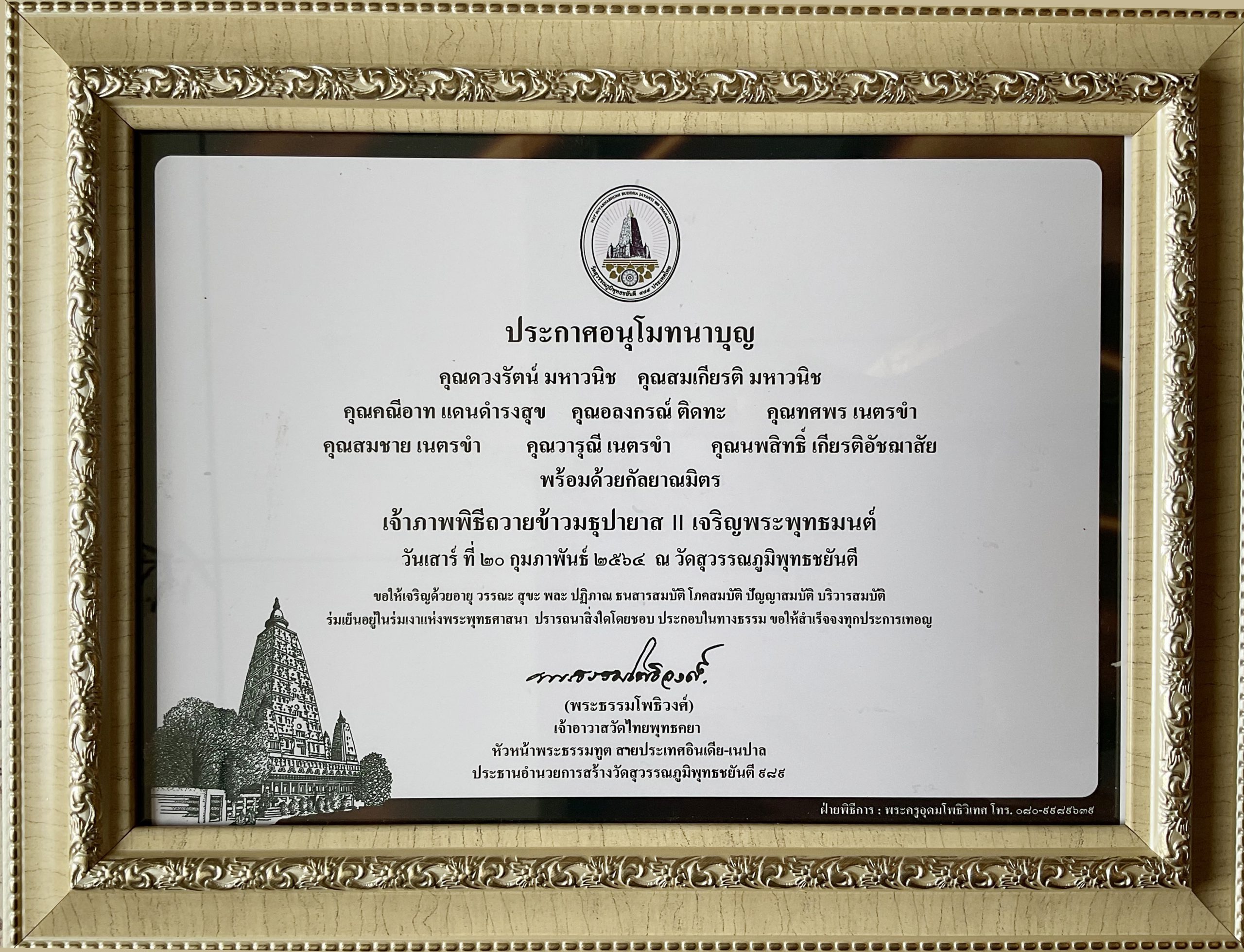 การนี้  นายสมเกียรติ – นางดวงรัตน์ มหาวนิช  ผู้พาคณะศรัทธาญาติธรรมไปกราบพระบาทพระศาสดา ณ แดนพุทธภูมิ สี่สังเวชนียสถาน พร้อมด้วย คณะศรัทธาญาติธรรม นายนพสิทธิ์ เกียรติอัชฌาสัย  นายสมชาย – นางวารุณี เนตรขำ  นางบัวสมุทร เขียววิลัย นางสาวพิสมัย ศิลปะชำนาญ  นางสาวบัวจตณา สูนปาน ฯลฯ ร่วมกันเป็นเจ้าภาพถวายข้าวมธุปายาส ณ วัดสุวรรณภูมิพุทธชยันตี ๙๘๙