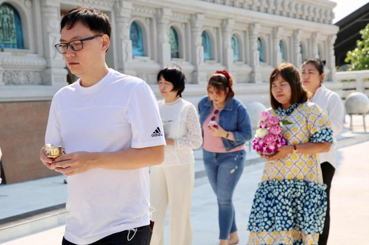 การนี้ นายสมเกียรติ – นางดวงรัตน์ มหาวนิช ผู้พาคณะศรัทธาญาติธรรมไปกราบพระบาทพระศาสดา ณ แดนพุทธภูมิ สี่สังเวชนียสถาน พร้อมด้วย คณะศรัทธาญาติธรรม นายนพสิทธิ์ เกียรติอัชฌาสัย นายสมชาย – นางวารุณี เนตรขำ นางบัวสมุทร เขียววิลัย นางสาวพิสมัย ศิลปะชำนาญ นางสาวบัวจตณา สูนปาน ฯลฯ ร่วมกันเป็นเจ้าภาพถวายข้าวมธุปายาส ณ วัดสุวรรณภูมิพุทธชยันตี ๙๘๙