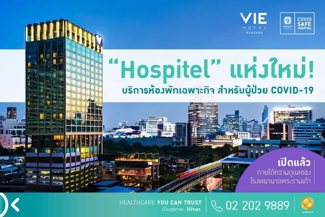 โรงพยาบาลพระรามเก้า ร่วมกับ โรงแรม วี กรุงเทพ (VIE HOTEL BANGKOK) เปิดบริการ Hospitel ห้องพักเฉพาะกิจ รองรับการรักษาผู้ป่วยโควิด-19 ที่ติดเชื้อแต่ยังหาเตียงไม่ได้ และอาการไม่รุนแรง หรือกลุ่มสีเขียว ภายใต้การดูแลของโรงพยาบาลพระรามเก้า ครบครันด้วยทีมบุคลากรและอุปกรณ์ทางการแพทย์ ทั้งนี้ยังได้เพิ่มห้องกลุ่มผู้ป่วยสีเหลือง โดยแยกพื้นที่ ward เฉพาะดูผู้ป่วยกลุ่มนี้ ไว้ 80 ห้อง และเสริมกลุ่มผู้ป่วยสีแดง ICU รองรับผู้ป่วยได้อีก 20 ห้อง โดยผู้ที่มีประกันสุขภาพ สามารถเคลมประกันได้ทุกกรณี