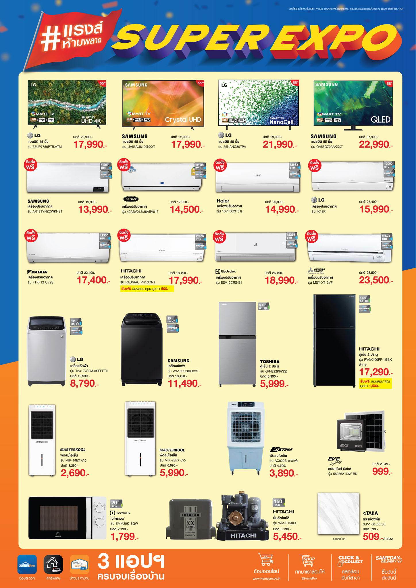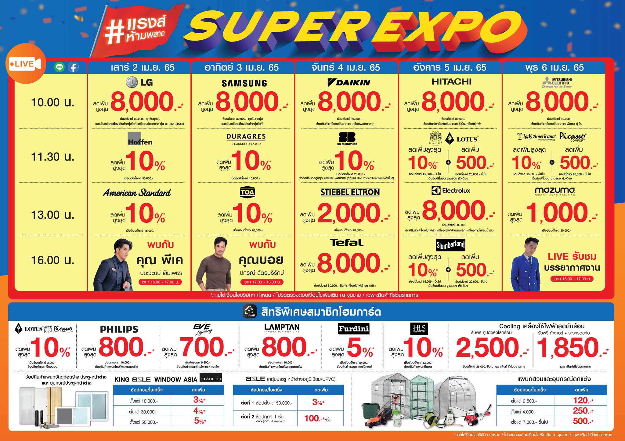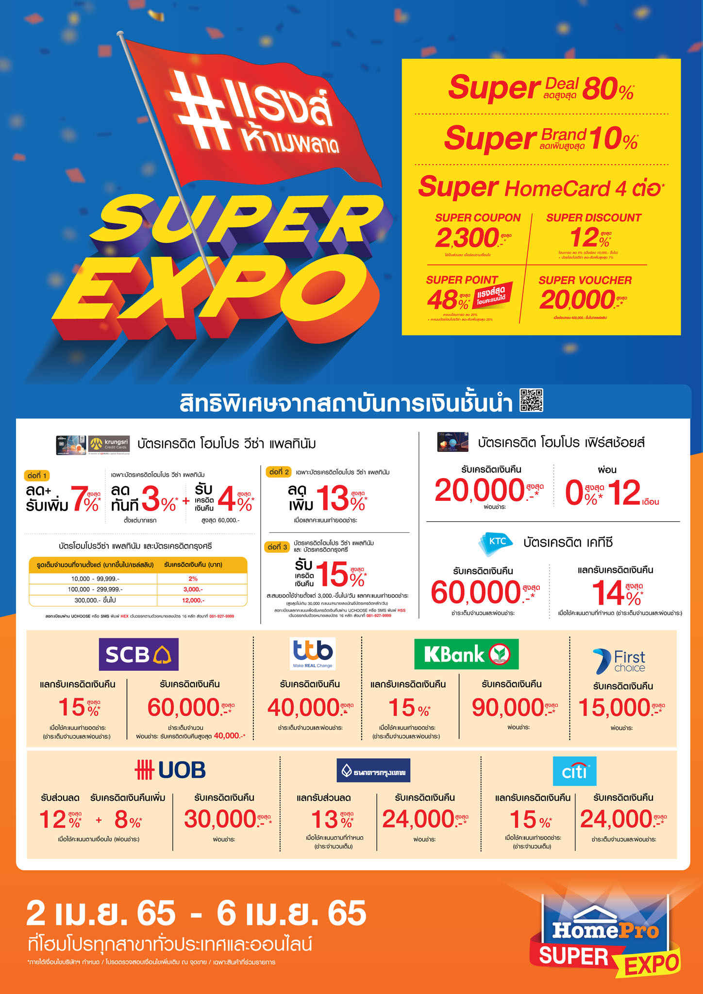 งาน HomePro SUPER EXPO ครั้งนี้ จะจัดขึ้นตั้งแต่วันที่ 2 เมษายน 65 – 6 เมษายน 65 รวม 5 วันเท่านั้น พบความพิเศษจากขบวนสินค้าเรื่องบ้าน และของตกแต่งบ้าน อัพเดทเทรนด์ใหม่รับหน้าร้อน ครบครันทุกแผนกให้เลือกสรร ไม่ว่าจะเป็น เครื่องใช้ไฟฟ้า, เฟอร์นิเจอร์, อุปกรณ์ห้องน้ำ, อุปกรณ์ครัว, ชุดห้องนอน, ห้องนั่งเล่น, สวน และอุปกรณ์ตกแต่ง, สินค้าปรับปรุง และซ่อมแซมบ้าน และอีกมากมาย พร้อมคุ้มค่ากว่าครั้งไหน ๆ #แรงส์ห้ามพลาด !! กับสินค้า Super Deal ลดสูงสุดถึง 80% คอมโบความคุ้มต่อเนื่องกับสินค้าแบรนด์ชั้นนำใน Super Brand ลดเพิ่มสูงสุดอีก 10%!!