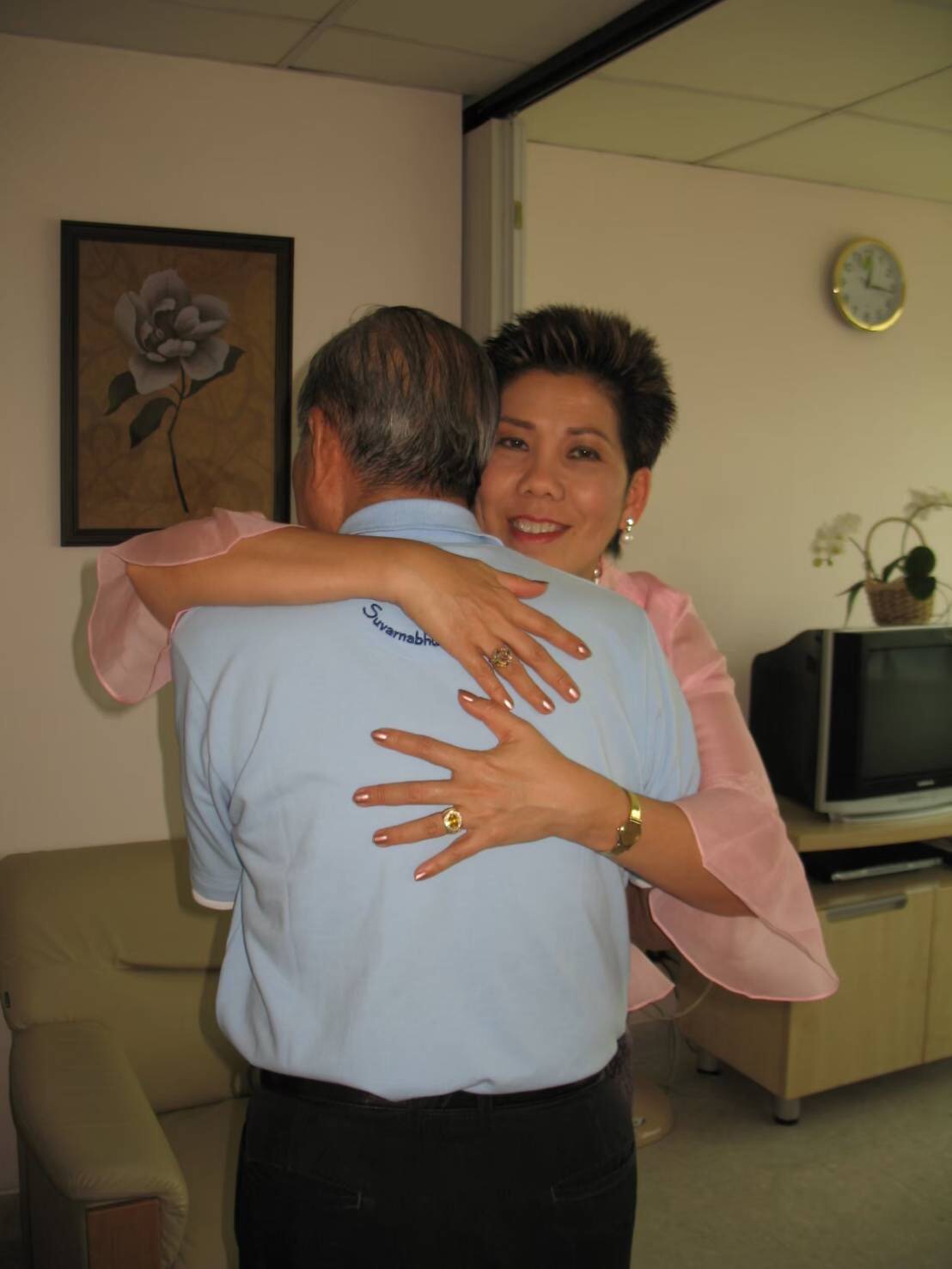 พี่แอ้ เล่าย้อนให้ฟังว่า เคยเป็นพยาบาลดูแลผู้ป่วยระยะสุดท้ายก่อนเกษียณประมาณ 10 ปี โดยเริ่มจากสามีป่วย ( คุณภุชงค์ นุตราวงศ์ อดีตเลขาธิการคณะกรรมการการเลือกตั้ง สำนักงานคณะกรรมการการเลือกตั้ง ) ตอนนั้นเกิดความคิดขึ้นมาว่าใครๆก็ต้องตาย แต่ก่อนตายอยากให้เขาตายอย่างมีความสุข อย่าต้องทนทุกข์ทรมาน ก็ดูแลสามีด้วยการให้ความรักที่เรียกว่า “การกอด” กอดเช้ากอดเย็นแล้วก็คิดว่าอีกไม่นานก็จะไม่มีเขาให้กอดแล้ว ก็เลยกอดมากๆและทุกครั้งที่กอดเราก็จะเพิ่มความรักความเข้าใจ เพิ่มความปรารถนาดีให้กับเขาตลอด ก็สัมผัสโดยใจสู่ใจก็ผ่านวิกฤติมาได้ 15 ปีและมีชีวิตที่แข็งแรงดี อยู่จนทะเลาะกันแล้ว