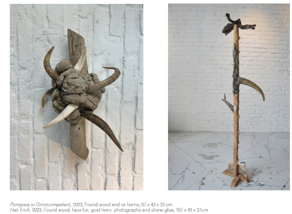 สำหรับผลงานในชื่อ แฮตทริก (2023) เป็นส่วนต่อขยายของวัตถุที่ถูกกู้คืนที่ยังคงต้องพยายามรักษาสมดุล ในขณะที่โครงสร้างรองรับที่ดูแห้งแล้งและเสริมกำลัง ทำให้นึกถึงการเผชิญปัญหา การเอาชีวิตรอด กลไก ประติมากรรมใช้รูปแบบมานุษยวิทยาที่แปลกประหลาดเพื่อกระตุ้นการรับรู้ทั้งทางร่างกาย และจิตวิญญาณเกี่ยวกับประวัติศาสตร์ และวิวัฒนาการ สิ่งเหล่านี้ทำหน้าที่เป็นอุปมาสำหรับการวางตำแหน่งที่ละเอียดอ่อนของวัฒนธรรมที่ต้องเผชิญกับโลกาภิวัตน์ที่รวดเร็ว และภูมิทัศน์ทางเศรษฐกิจและสังคมที่เปลี่ยนแปลงตลอดเวลา