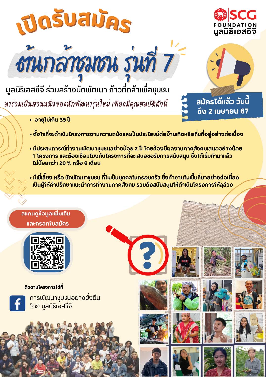 มูลนิธิเอสซีจี ขอเชิญคนรุ่นใหม่ อายุไม่เกิน 35 ปีและมีหัวใจนักพัฒนา ที่ต้องการสร้างความเข้มแข็งอย่างยั่งยืนให้กับบ้านเกิด เข้าร่วมโครงการ “ต้นกล้าชุมชน รุ่นที่ 7” โดยผู้ที่ผ่านการคัดเลือกเป็น ‘ต้นกล้าชุมชน’ ต้องดำเนินโครงการตามที่ถนัดและเป็นประโยชน์ต่อสาธารณะในชุมชน ภายใต้การดูแลและแนะนำจากพี่เลี้ยงที่เป็นนักพัฒนามืออาชีพในท้องถิ่น ตลอดจนเข้าร่วมหลักสูตรพัฒนาศักยภาพตามที่มูลนิธิฯ กำหนดตลอด3 ปีเพื่อฝึกฝนพัฒนาความรู้ ความสามารถพร้อมเป็นกำลังสำคัญในการสร้างงาน  สร้างอาชีพ พัฒนาต่อยอดผลิตภัณฑ์ และทุนทางวัฒนธรรมอย่างสร้างสรรค์เพื่อยกระดับคุณภาพชีวิต และสร้างกระบวนการเรียนรู้เพื่ออยู่รอดพึ่งพาตัวเองได้อย่างยั่งยืนต่อไป เปิดรับสมัครแล้ววันนี้ถึง 2 เมษายน 2567