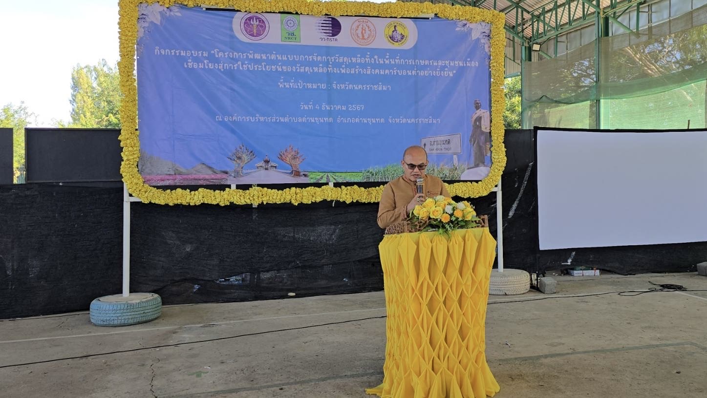 ดร.ประทีป วงศ์บัณฑิต รองผู้ว่าการวิจัยและพัฒนาด้านพัฒนาอย่างยั่งยืน สถาบันวิจัยวิทยาศาสตร์และเทคโนโลยีแห่งประเทศไทย (วว.) กระทรวงการอุดมศึกษา วิทยาศาสตร์ วิจัยและนวัตกรรม (อว.) เป็นประธานเปิดกิจกรรมอบรมเชิงปฏิบัติการ “โครงการพัฒนาต้นแบบการจัดการวัสดุเหลือทิ้งในพื้นที่การเกษตรและชุมชนเมือง เชื่อมโยงสู่การใช้ประโยชน์ของวัสดุเหลือทิ้งเพื่อสร้างสังคมคาร์บอนต่ำอย่างยั่งยืน” เมื่อวันที่ 4 ธันวาคม 2567 ณ จังหวัดนครราชสีมา