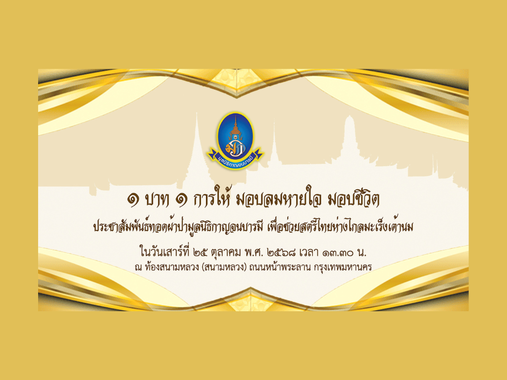 “๑ บำท ๑ การให้ มอบลมหายใจ มอบชีวิต” มูลนิธิกาญจนบารมี จะมั่นคงถาวรอยู่ได้เพราะเงิน ๑ บาท ที่เราเสียสละสนับสนุนอย่างติดต่อต่อเนื่อง จะได้เป็นพื้นเป็นฐานเป็นขบวนการที่ถาวรยั่งยืน เป็นความดีและปัญญาติดต่อต่อเนื่อง เป็นการเข้าถึงความพอเพียงเพียงพอ โครงการคัดกรองมะเร็งเบื้องต้นนี้ เป็นโครงการที่ดีมาก ดีจริง ๆ มีประโยชน์ต่อส่วนรวม มีประโยชน์ต่อมหาชน โครงการนี้จะก้าวไปได้ด้วยความมั่นคงของชาติศาสน์กษัตริย์ จึงได้ประกาศประชาสัมพันธ์ให้มหาชนได้รับทราบทั่วกัน เพื่อความสมัครสมานสามัคคี เป็นความดีที่ประกอบด้วยปัญญา เป็นปัญญาประกอบด้วยความดี ปัจจุบันปี พ.ศ. ๒๕๖๘ นี้ ประเทศไทยเรามีประชากรในทะเบียนราษฎร์ ๖๕,๙๓๒,๑๐๕ คน ถ้าประชาชนทุกคนมีความเห็นไปในทางเดียวกัน มีความสมัครสมานสามัคคี ก้าวไปด้วยความดีและปัญญา เสียสละบริจาคเงินคนละ ๑ บาท เพื่อสนับสนุนมูลนิธิกาญจนบารมี เพื่อให้แพทย์พยาบาลไปตรวจคัดกรองมะเร็งเต้านมและมะเร็งนรีเวช ระยะต้นระยะกลาง เพื่อไม่ให้สายเกินแก้ ทางมูลนิธิก็จะมีเงินในการบริหารการทำงาน จากความสมัครสมานสามัคคี จำนวน ๖๕,๙๓๒,๑๐๕ บาท คำนวนจากประชากรของประเทศ ซึ่งสามารถบริหารโครงการได้เป็นเวลา ๑ ปี ในขณะนี้ ทางมูลนิธิได้ใช้เงินบริหารโครงการเดือนละ ๔ ล้านกว่าบาท ใช้เงินกันอย่างประหยัดไม่ฟุ่มเฟือย ผู้บริหารมูลนิธิทุกคน ไม่รับค่าตอบแทนเงินเดือนในการบริหาร เงินส่วนนี้นำไปใช้เฉพาะเงินเดือนแพทย์พยาบาลเจ้าหน้าที่พนักงาน และค่าน้ำมันรถ จึงประชาสัมพันธ์ให้ผู้ที่เสียสละเป็นเจ้าภาพร่วมกันทุกท่าน ได้พากันเข้าใจตามนี้