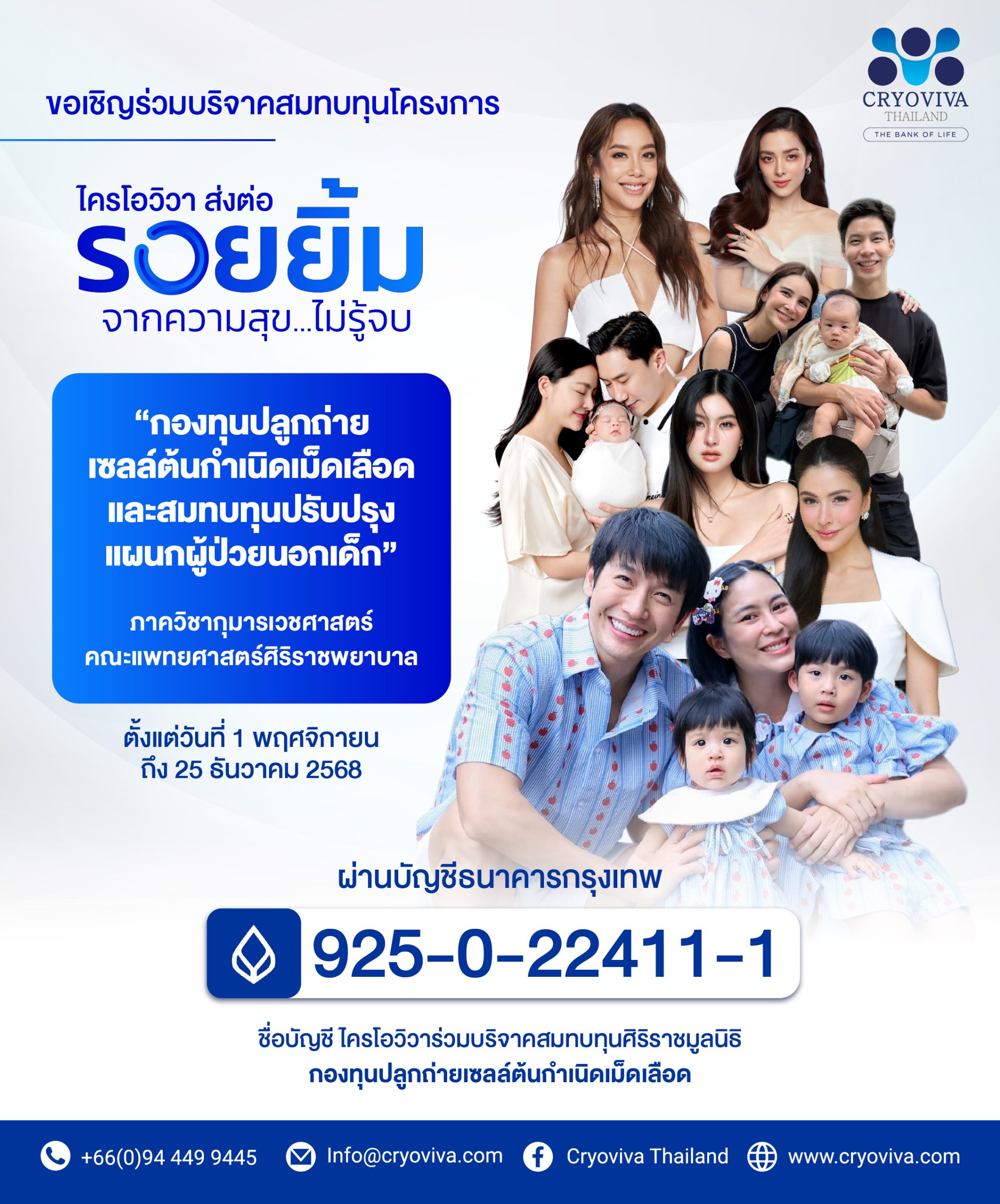 โครงการ ‘ไครโอวิวา ส่งต่อรอยยิ้มจากความสุข…ไม่รู้จบ ปีที่ 2’ ส่งท้ายปีเก่าต้อนรับปีใหม่ด้วยการให้ที่ยิ่งใหญ่! 7 ครอบครัวดารา ซึ่งเป็นครอบครัวของ “Cryoviva Family” ที่เชื่อมั่นในมาตรฐานการจัดเก็บเซลล์ต้นกำเนิดของ บริษัท ไครโอวิวา (ประเทศไทย) จำกัด ธนาคารจัดเก็บสเต็มเซลล์ระดับโลก และผู้นำนวัตกรรมสเต็มเซลล์หนึ่งเดียวในไทยที่ได้รับถึง 3 มาตรฐาน AABB ได้ผนึกกำลังร่วมกับ ศิริราชมูลนิธิ เชิญชวนคนไทยร่วมเป็นส่วนหนึ่งของการสร้างชีวิตใหม่ให้กับผู้ป่วยเด็กที่รอคอยการปลูกถ่ายสเต็มเซลล์ ภายใต้โครงการ “ไครโอวิวา ส่งต่อรอยยิ้มจากความสุข…ไม่รู้จบ ปีที่ 2”