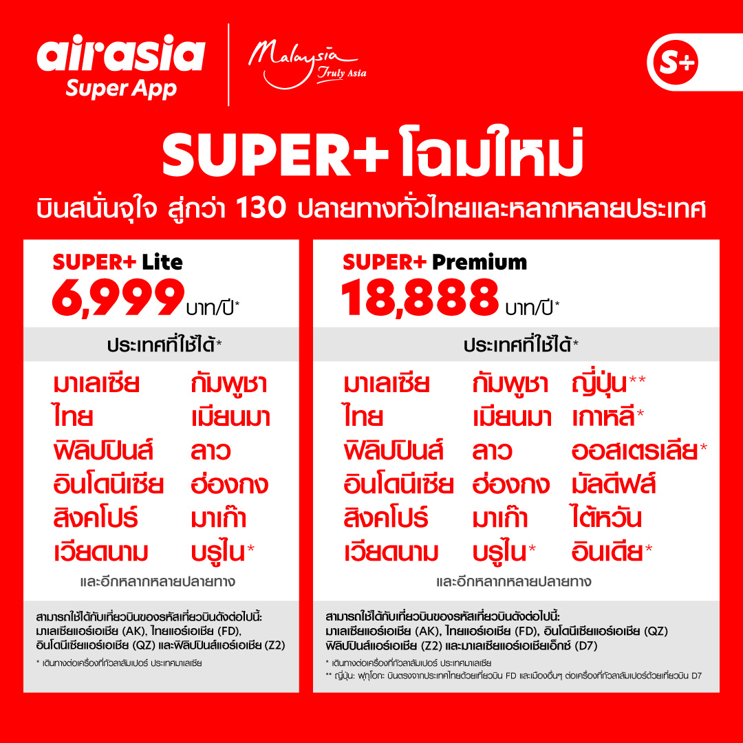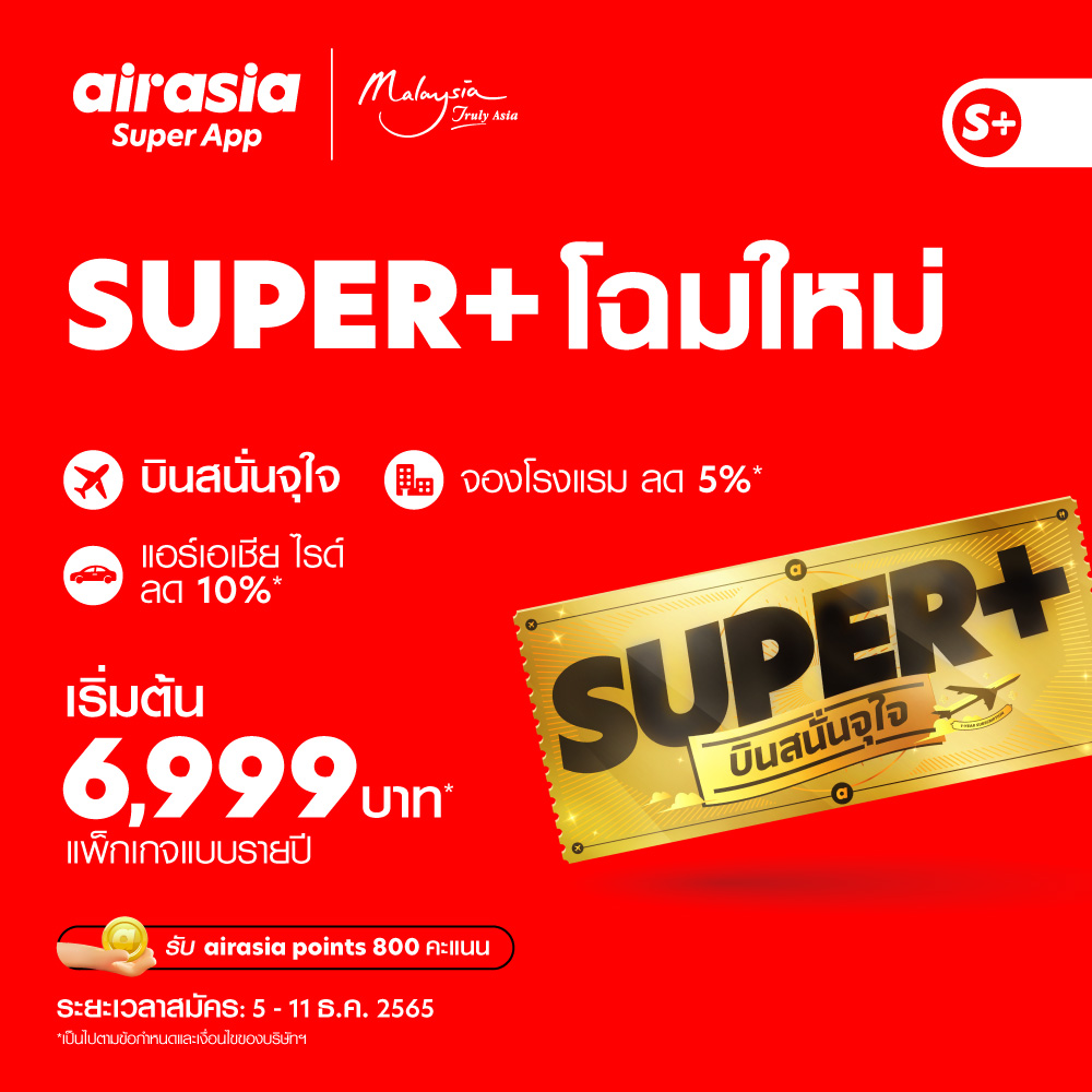 *ตรวจสอบข้อกำหนดเเละเงื่อนไข SUPER+ Subscription (ธันวาคม 2565)เพิ่มเติมก่อนการสมัครได้ที่ https://www.airasia.com/superplus/en/gb/terms-and-conditions/superplua-lp-th