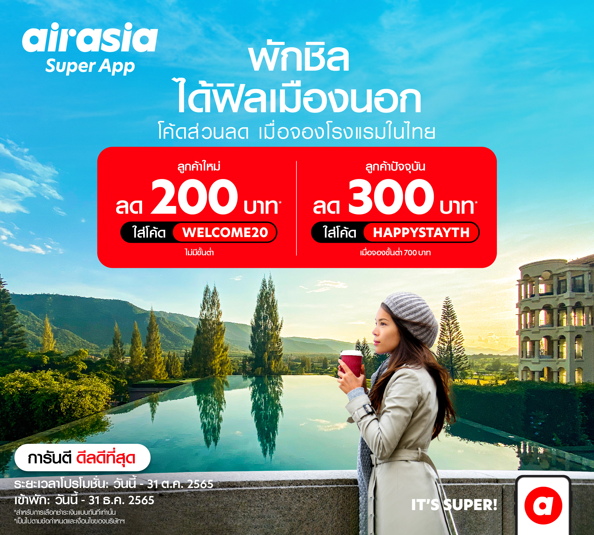 แจกโค้ดส่วนลดโรงแรม 300 บาท ทุกการจองโรงแรมในประเทศ ผ่าน airasia Super App เพียงจองขั้นต่ำ 700 บาทขึ้นไป ใช้ส่วนลดได้ 1 ครั้งต่อ 1 ผู้ใช้งานเท่านั้น สำหรับลูกค้าใหม่และลูกค้าเก่า จองตั้งแต่วันที่ 17 – 31 ตุลาคม 2565 นี้เท่านั้น เข้าพักได้ตั้งแต่วันที่ 17 ต.ค. 2565 – 31 ธ.ค. 2565