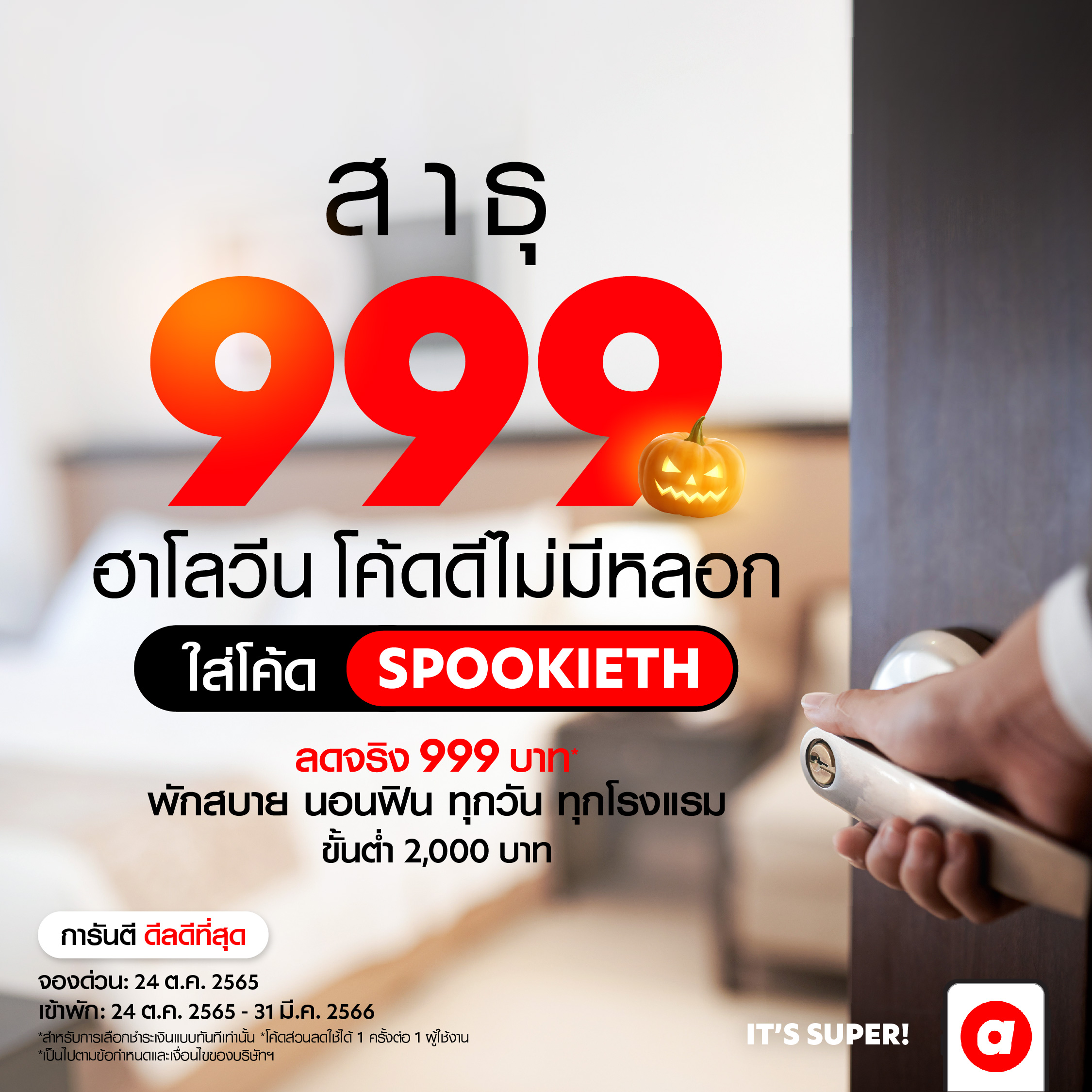 มอบส่วนลดส่งท้ายเดือนตุลาคมช่วงเทศกาลฮาโลวีน ด้วยโค้ดสุดพิเศษ เพียงใส่ “THB999” เมื่อจองโรงแรมในประเทศผ่าน airasia Super App ขั้นต่ำ 2,000 บาท รับไปเลยส่วนลดค่าโรงแรม 999 บาท สำหรับลูกค้าใหม่และลูกค้าเก่า จองตั้งเเต่วันที่ 23-24 ตุลาคม 2565 นี้ เข้าพักได้ตั้งแต่วันที่ 23 ต.ค. 2565 – 31 มี.ค. 2566