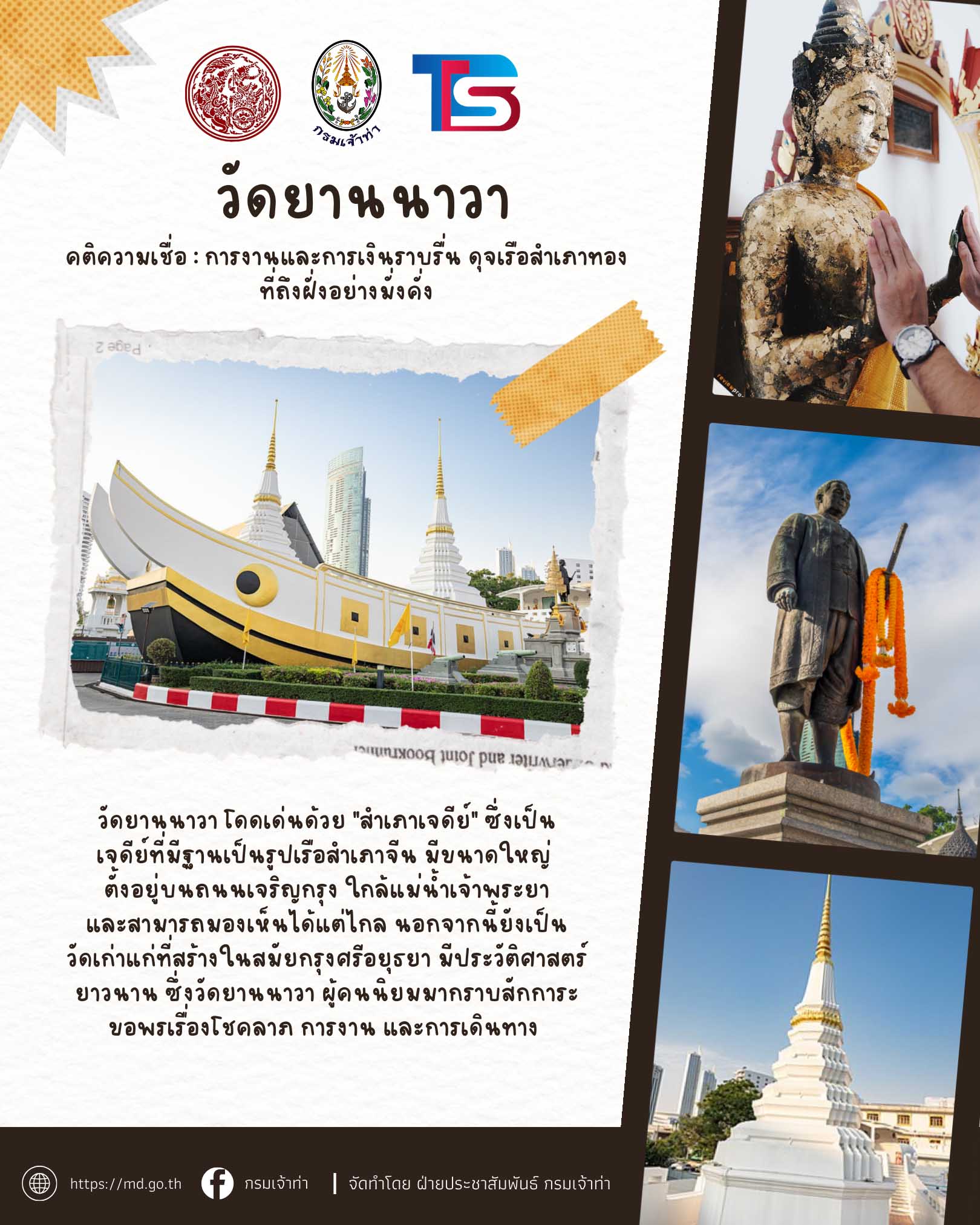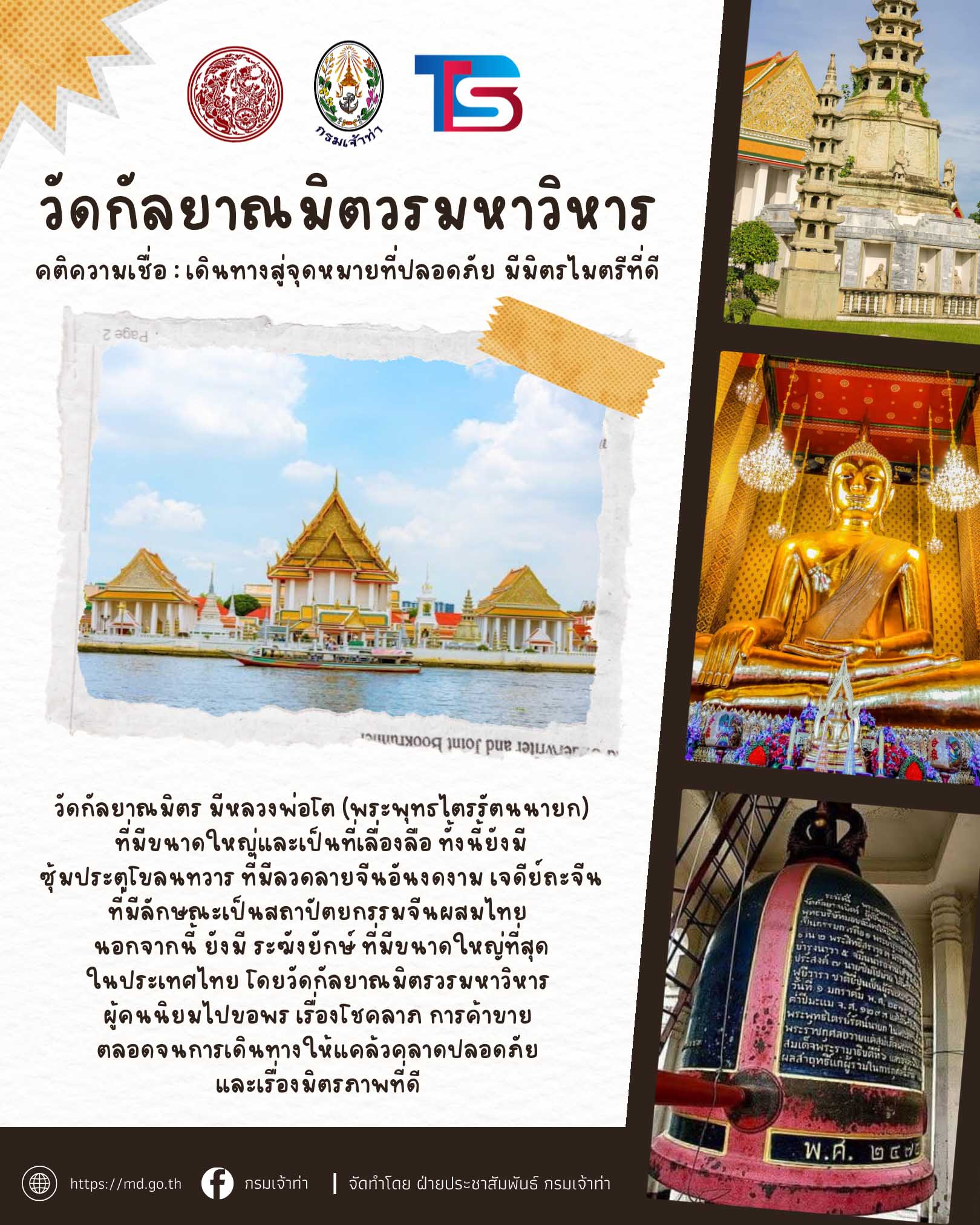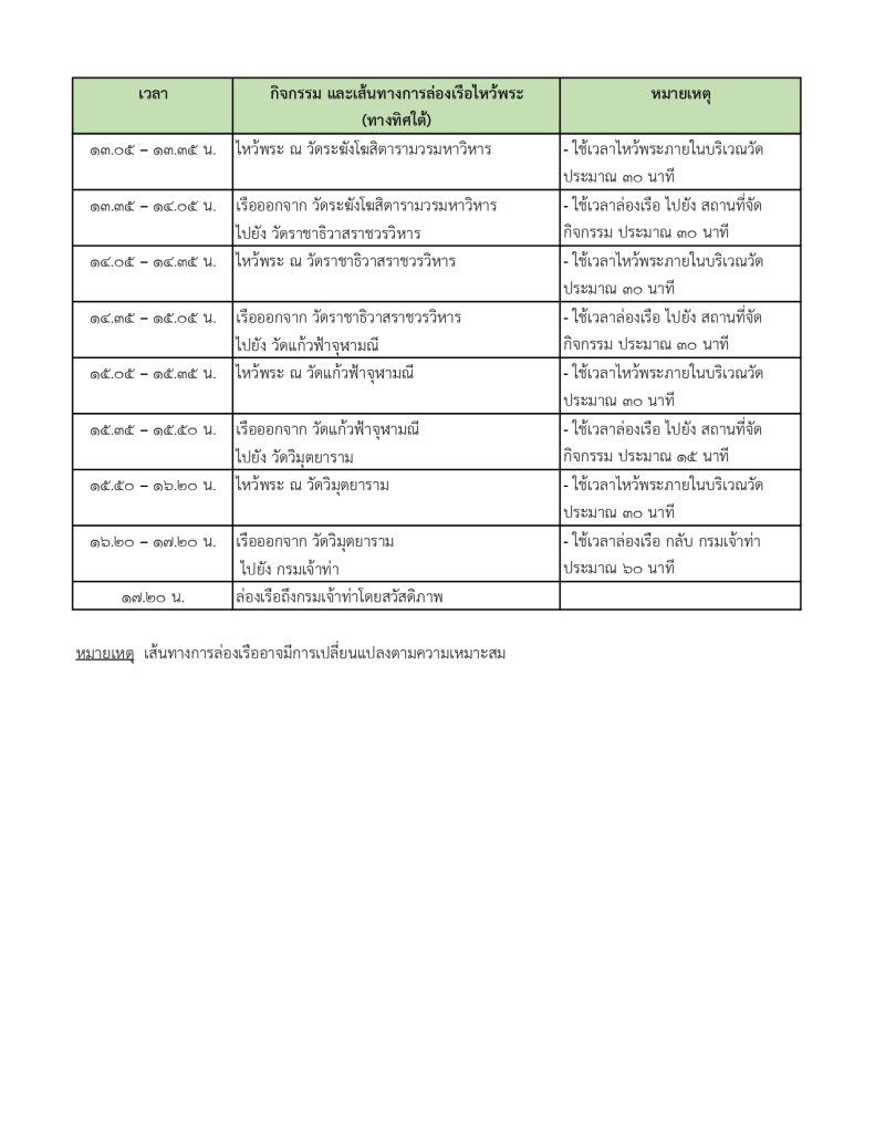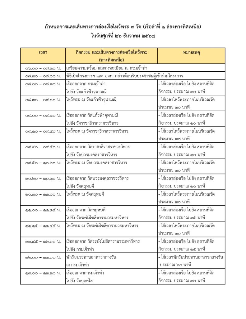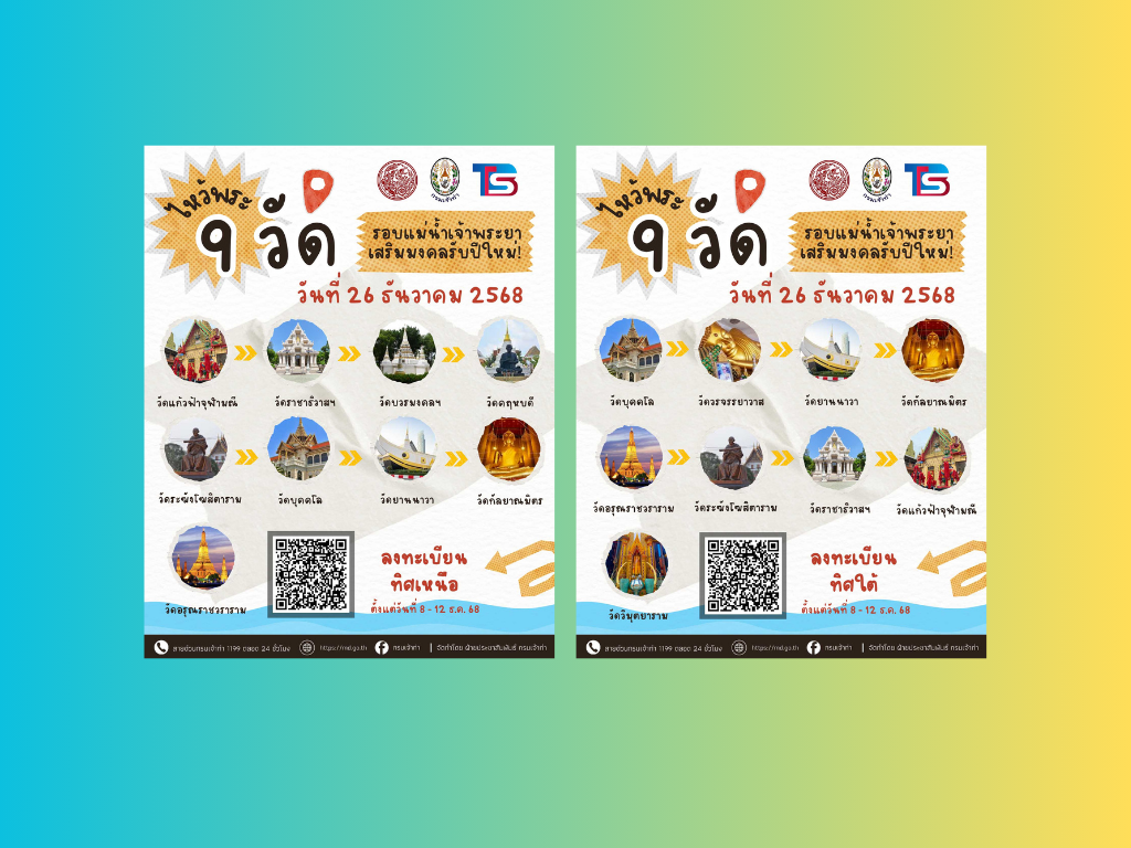 กระทรวงคมนาคมและกรมเจ้าท่า ร่วมกับบริษัทไทยสมายล์โบ้ท จัดโครงการ ” ล่องเรือไหว้พระ 9 วัด รับปีใหม่ 2569 ” เพื่อมอบเป็นของขวัญแก่พี่น้ องประชาชนโดยโครงการจะจัดขึ้ นในวันที่ 26 ธันวาคม 2568 (วันงานผู้ที่มาร่วมงานเช็คชื่ อพร้อมกันเวลา 06:00 – 07:30 น. ที่กรมเจ้าท่า)