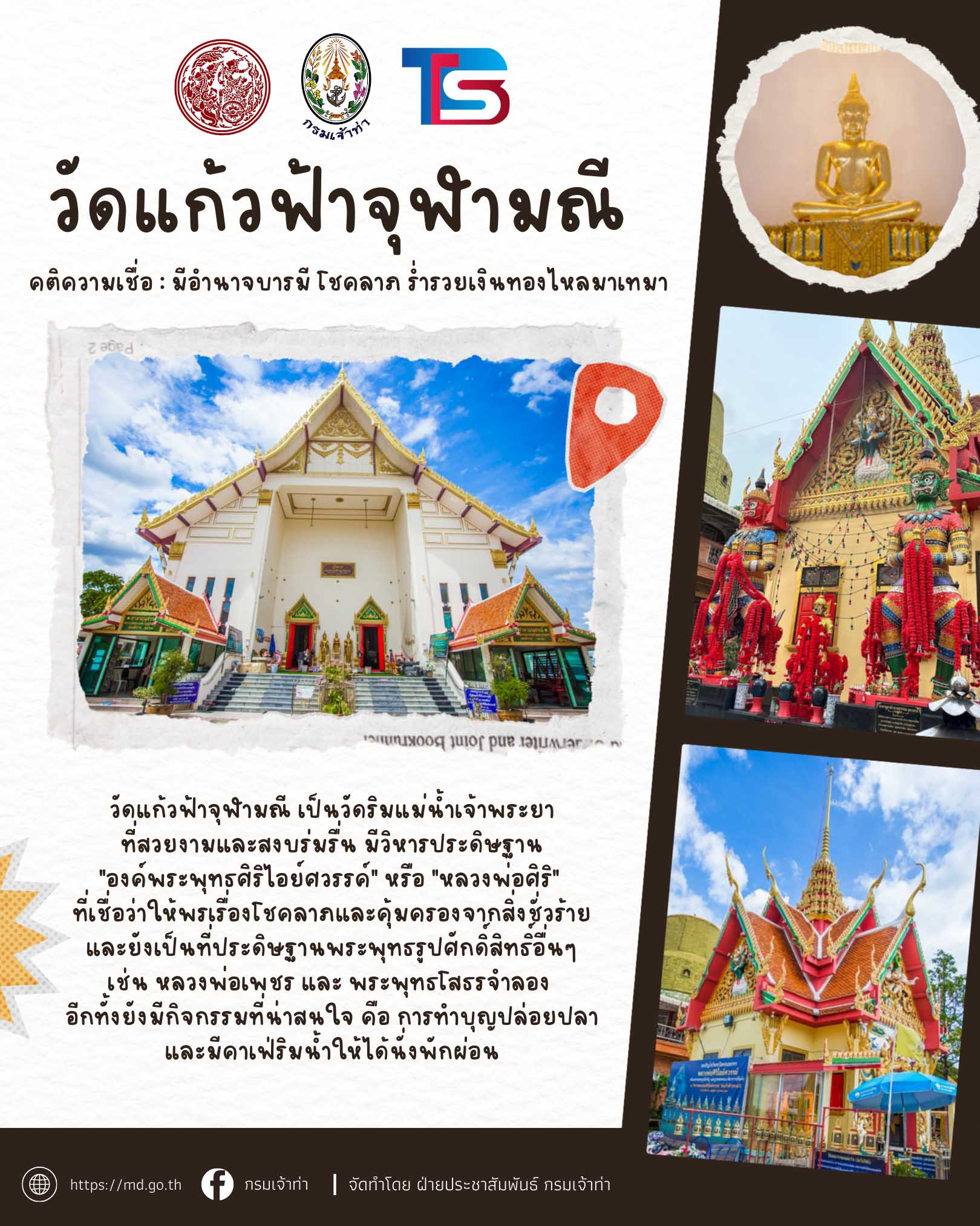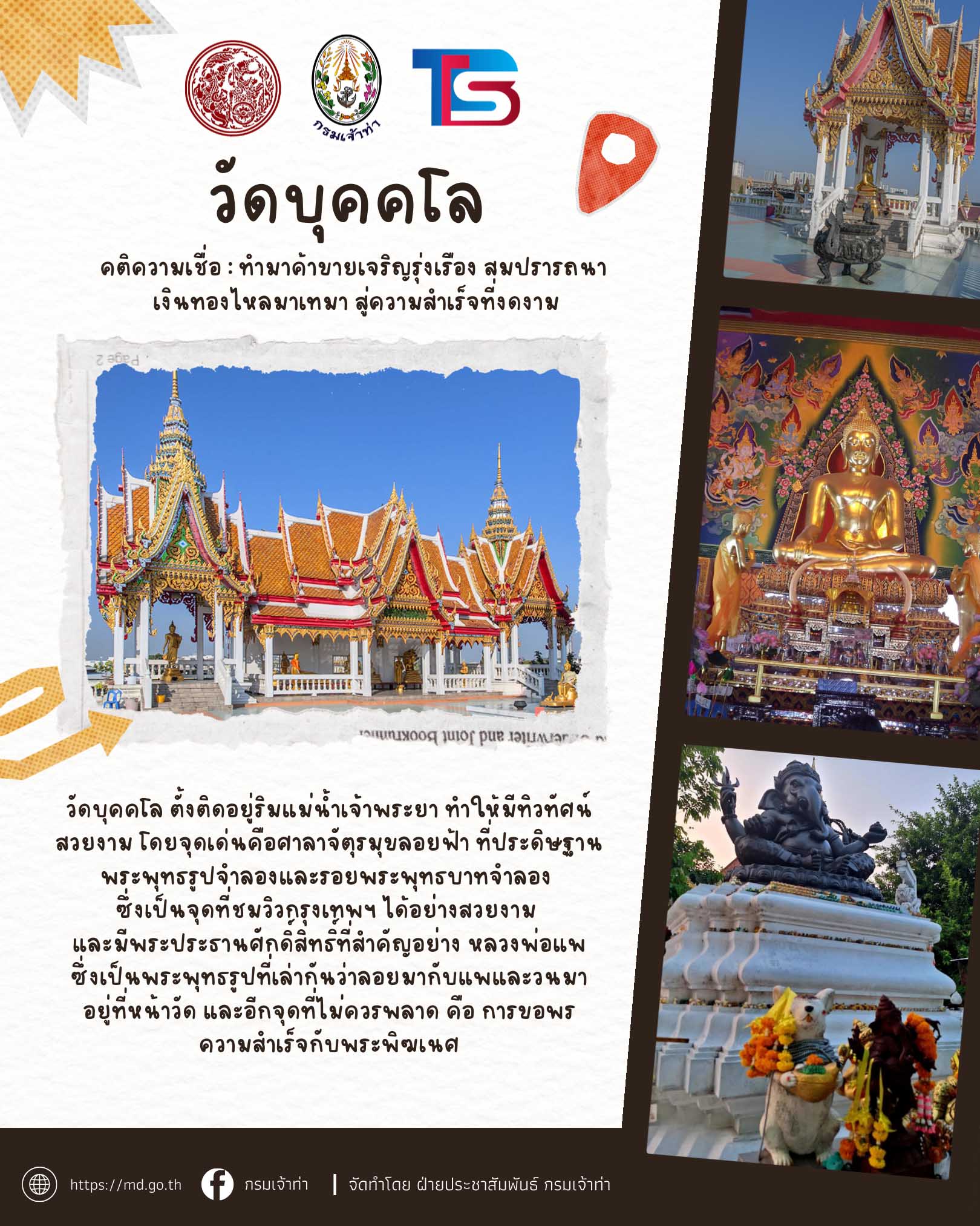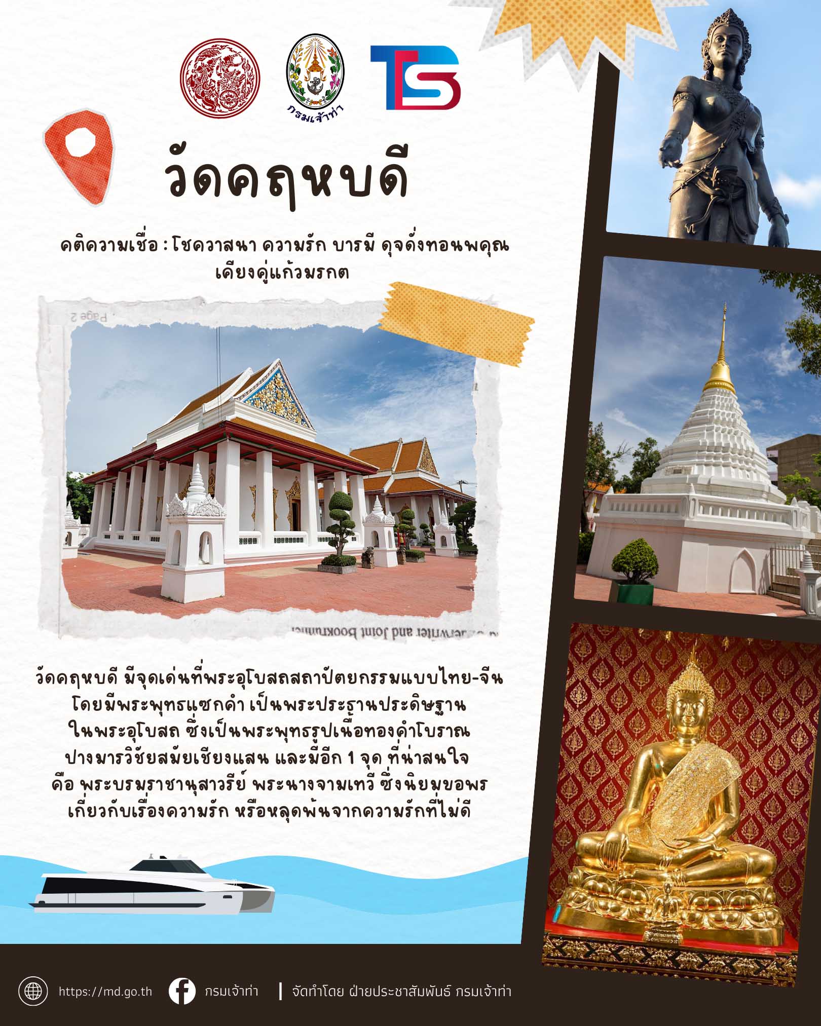 กระทรวงคมนาคมและกรมเจ้าท่า ร่วมกับบริษัทไทยสมายล์โบ้ท จัดโครงการ ” ล่องเรือไหว้พระ 9 วัด รับปีใหม่ 2569 ” เพื่อมอบเป็นของขวัญแก่พี่น้ องประชาชนโดยโครงการจะจัดขึ้ นในวันที่ 26 ธันวาคม 2568 (วันงานผู้ที่มาร่วมงานเช็คชื่ อพร้อมกันเวลา 06:00 – 07:30 น. ที่กรมเจ้าท่า)