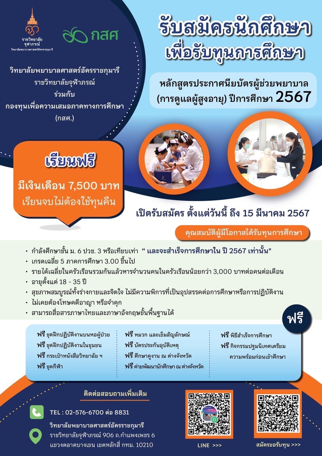 วิทยาลัยพยาบาลศาสตร์อัครราชกุมารี ราชวิทยาลัยจุฬาภรณ์ ร่วมกับ กองทุนเพื่อความเสมอภาคทางการศึกษา (กสศ.) ดำเนินการ โครงการทุนนวัตกรรมสายอาชีพชั้นสูง ปีการศึกษา 2567 เพื่อมอบทุนการศึกษาให้กับนักเรียน นักศึกษา ที่มีความสนใจศึกษาต่อในหลักสูตรประกาศนียบัตรผู้ช่วยพยาบาล (การดูแลผู้สูงอายุ) หลักสูตร 1 ปี รุ่นที่ 4 เพื่อสร้างความเสมอภาคทางการศึกษา สนับสนุนความช่วยเหลือผู้ขาดแคลนทุนทรัพย์ และผู้ด้อยโอกาสให้ได้รับการศึกษาในสาขาที่ขาดแคลน ตอบโจทย์ความต้องการกำลังคนของประเทศในปัจจุบัน ผู้สำเร็จการศึกษา สามารถทำงานได้ในโรงพยาบาลของรัฐบาลและเอกชน ตลอดจนหน่วยบริการสุขภาพทุกระดับ ทั้งในและต่างประเทศได้