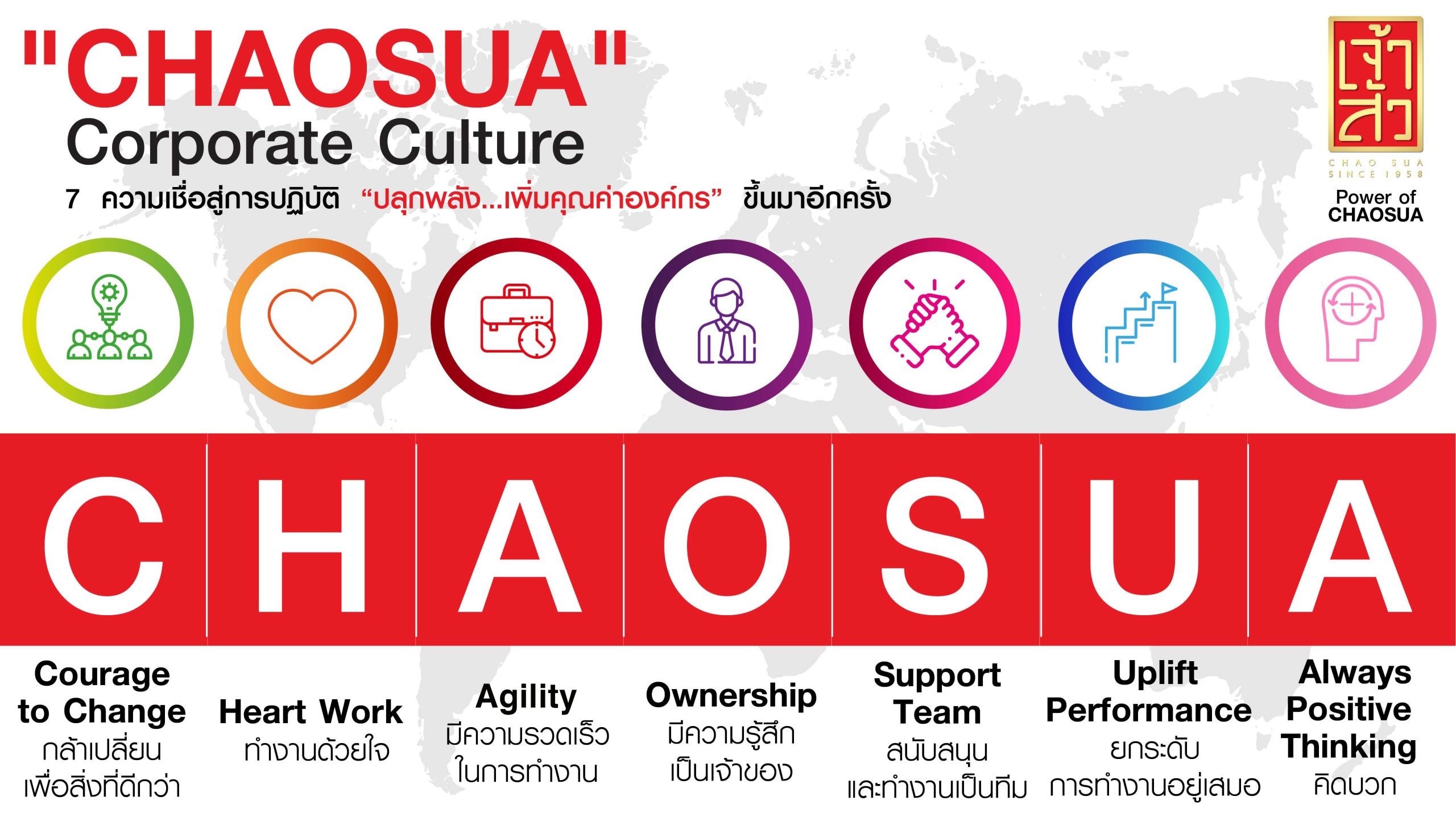 สำหรับ Core Values ของเจ้าสัว ประกอบ ด้วย 7 ตัวอักษร C-H-A-O-S-U-A คือ C – Courage to Change กล้าเปลี่ยน เพื่อสิ่งที่ดีกว่า ซึ่งเป็นความกล้าที่จะปรับเปลี่ยนไปตามสถานการณ์ และกล้าลองทำสิ่งใหม่ๆ H – HEart work ทำงานด้วยใจ ที่เน้นความใส่ใจในการทำงาน มีวินัยมุ่งมั่นที่จะพัฒนา และไม่ย่อท้อต่ออุปสรรคต่าง ๆ A – AGILITY ความรวดเร็วในการทำงาน ชูการปฎิบัติงานในเชิงรุก กระตือรือร้น ขยันและมีพลัง ทำให้งานเดินหน้าไปอย่างรวดเร็ว O – Ownership ความรู้สึกเป็นเจ้าของ สร้างวิสัยทัศน์ในการทำงานให้เหมือนเป็นธุรกิจของตัวเอง โดยกำหนดเป้าหมายเดียวกันเพื่อประสบความสำเร็จไปพร้อมกับองค์กร