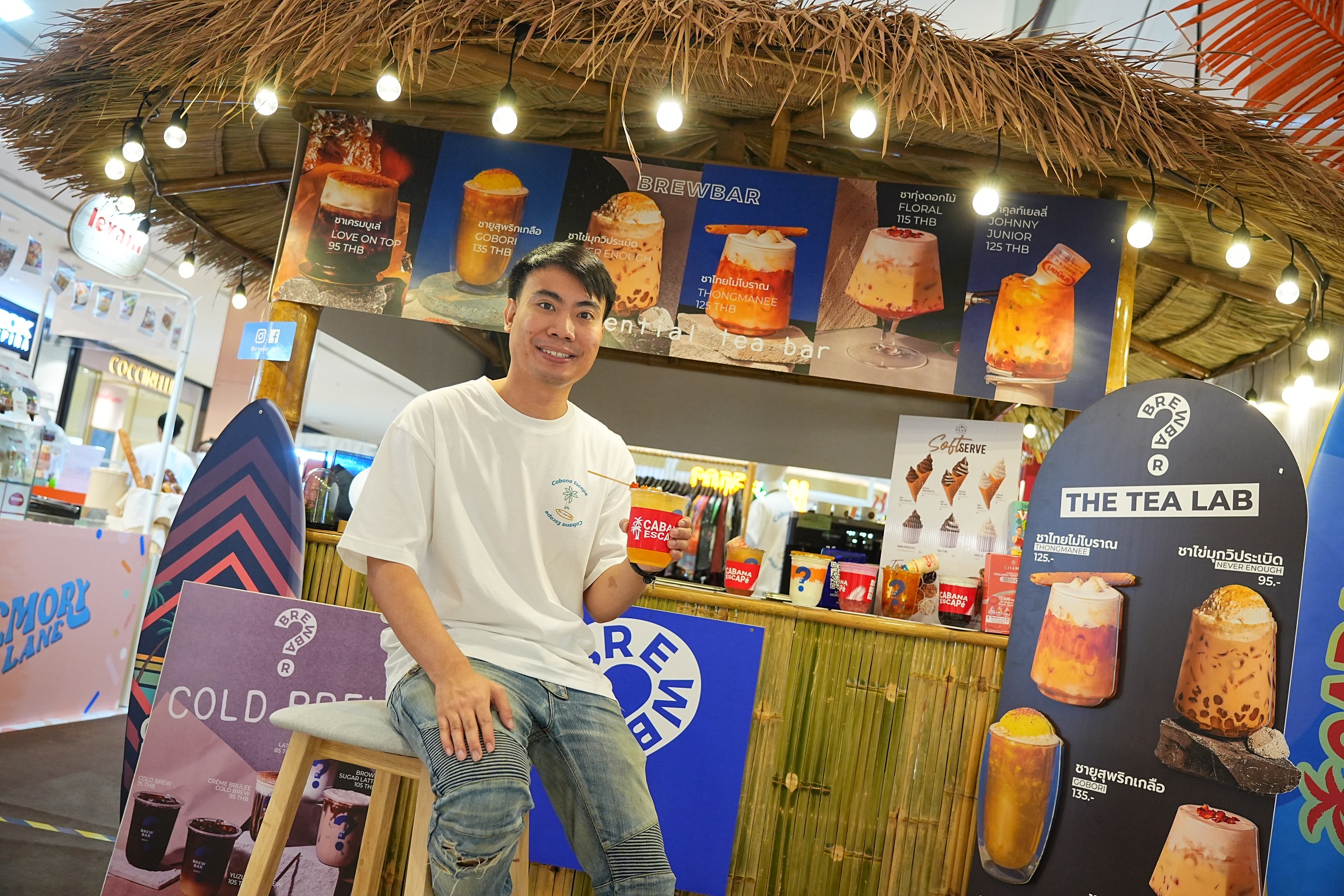 อีกแบรนด์ที่น่าสนใจอย่าง Brew Bar เจ้าของคือ คุณพีค ชยานันต์ จันทร์สว่าง ที่รังสรรค์ชาในคอนเซ็ปต์ Creative Drink เล่าว่า “เดิมทำแบรนด์ Fresh Me ชานมไข่มุกชื่อดังมาก่อน แล้วมาทำแบรนด์ชาสกัดสด Brew Bar มีจุดเด่นคือ การสกัดสดแก้วต่อแก้ว ซึ่งเราเป็นเจ้าเดียวในไทยที่มีเครื่องนี้ ชาของเราเน้นคอนเซ็ปต์ ‘ชาฟิวชั่น’ เป็นชาแนวครีเอทีฟรสชาติแบบไม่มีที่ไหนมาก่อน จากคอร์สนี้เราได้จับมือกับ Beautrium คิดไอเดียชาสกัดสดผสมคอลลาเจนอร่อยด้วย สวยด้วย ได้ส่วนผสมคอลลาเจนคุณภาพจากแบรนด์ดัง ‘Chame (ชาเม่)’ และอีกเมนูที่ไม่มีที่ไหนแน่นอน คือ “Chunn” ร้านข้าวหน้าเนื้อเจ้าดัง ทำ ‘ชาหน้าเนื้อ’ ที่มีท้อปปิ้งเป็นไข่ดอง ได้เมนูสุดแปลกแต่อร่อยลงตัว คอร์สนี้ ทำให้เราได้ประสบการณ์เยอะมาก ได้ความรู้หลากหลายด้านที่มาปรับใช้กับแบรนด์ Brew Bar การได้มาออกร้านใน Pop up เป็นประสบการณ์ใหม่ที่เราไม่เคยทำมาก่อน ทำให้เรารู้สึกว่าถ้าจบคอร์สนี้ไปแล้ว ก็อยากที่จะมาออกบูท ทำอะไรสนุกๆ แบบนี้อีกในอนาคตแน่นอน”