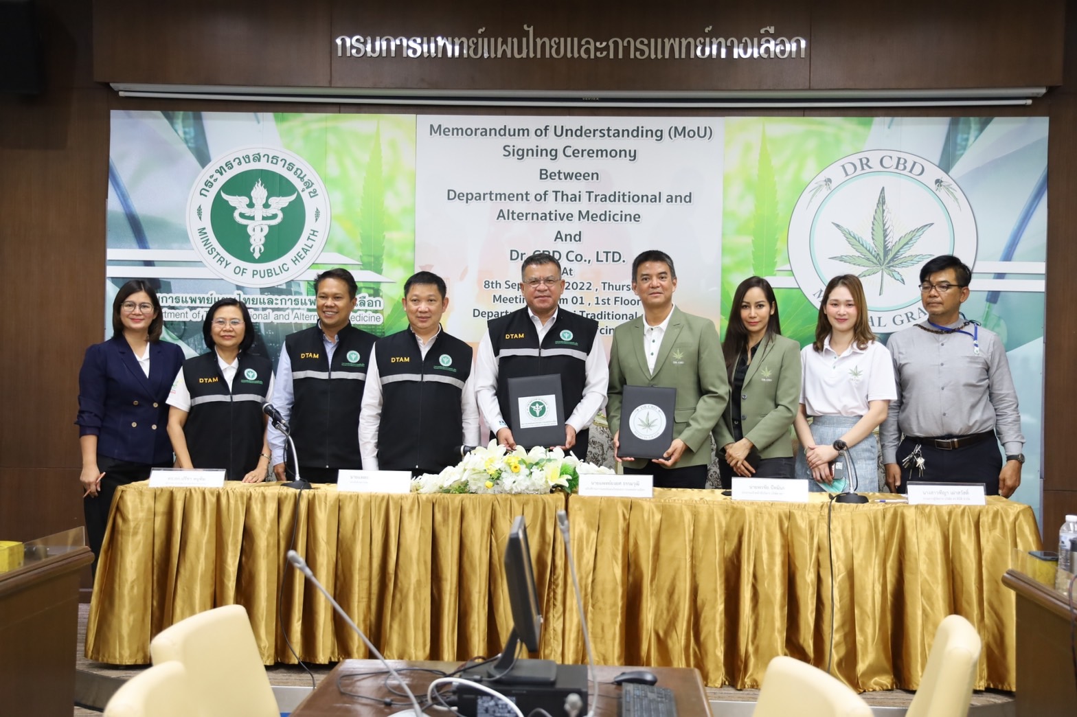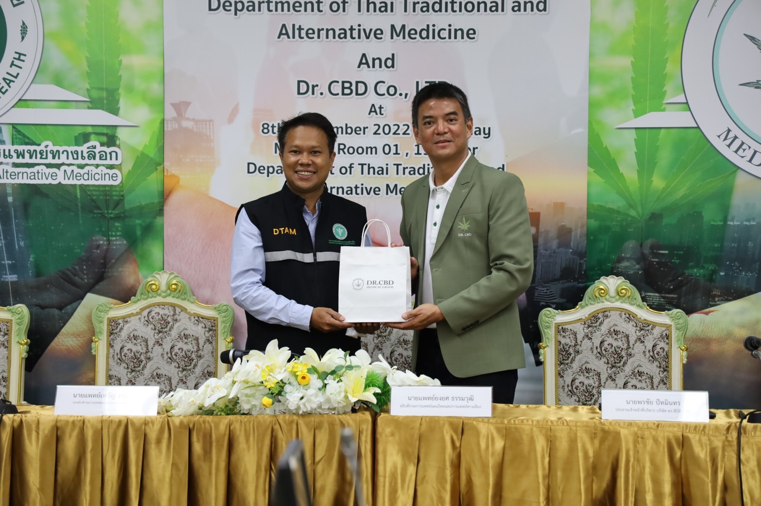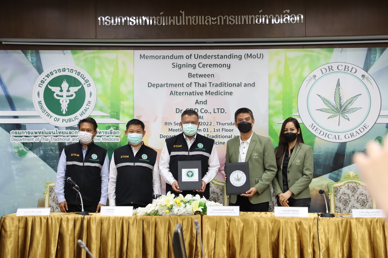 วันที่ 8 กันยายน 2565 นายพรชัย ปัทมินทร ประธานเจ้าหน้าที่บริหาร ดร.ซีบีดี จำกัด ธุรกิจด้าน Health Care ผู้ให้บริการครบวงจรทางด้านกัญชา กัญชง และกระท่อมระดับมาตรฐานทางการแพทย์ เข้าพบนายยงยศ ธรรมวุฒิ อธิบดีกรมการแพทย์แผนไทยและการแพทย์ทางเลือก เพื่อบันทึกข้อตกลงความร่วมมือ ส่งเสริม สนับสนุนการผลิตศึกษา วิจัย การแปรรูป การสกัด การตรวจวิเคราะห์ การพัฒนาผลิตภัณฑ์ การพัฒนายาจากสมุนไพร รวมทั้งกัญชา กัญชง กระท่อม เพื่อใช้ประโยชน์ทางการแพทย์ ทางวิทยาศาสตร์ และทางอุตสาหกรรม ซึ่งร่วมลงนามเป็นพยาน ณ กรมการแพทย์แผนไทยและการแพทย์ทางเลือก