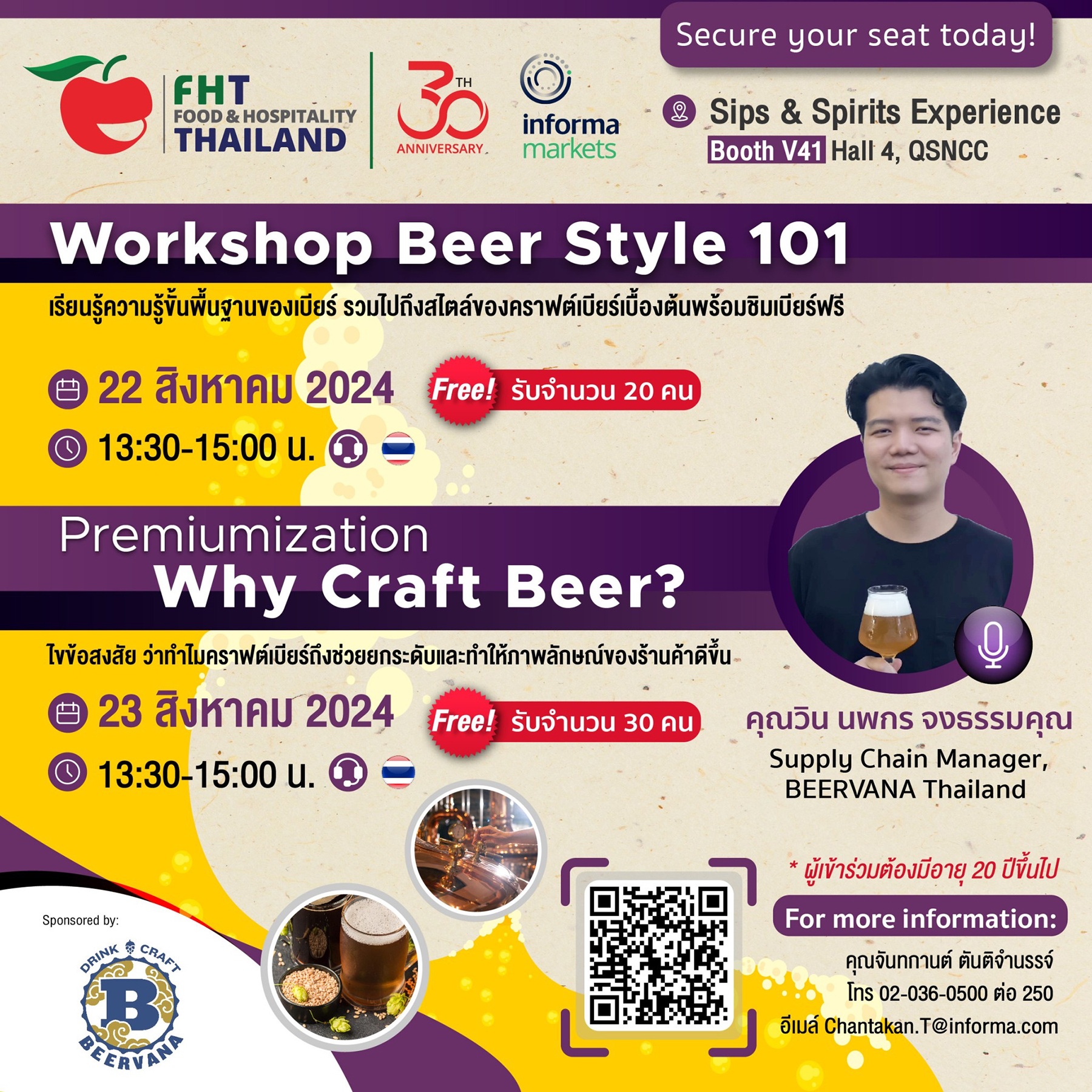 - Premiumization Why Craft Beer? เวลา30-15.00 น. ร่วมไขข้อข้องใจ ทำไมคราฟต์เบียร์ถึงช่วยยกระดับและสร้างภาพลักษณ์ของร้านให้ดีขึ้นได้ โดยคุณวิน นพกร จงธรรมคุณ Supply Chain Manager, BEERVANA Thailand เข้าร่วมการอบรมได้ฟรี (รับจำนวนจำกัด 30 ที่นั่ง