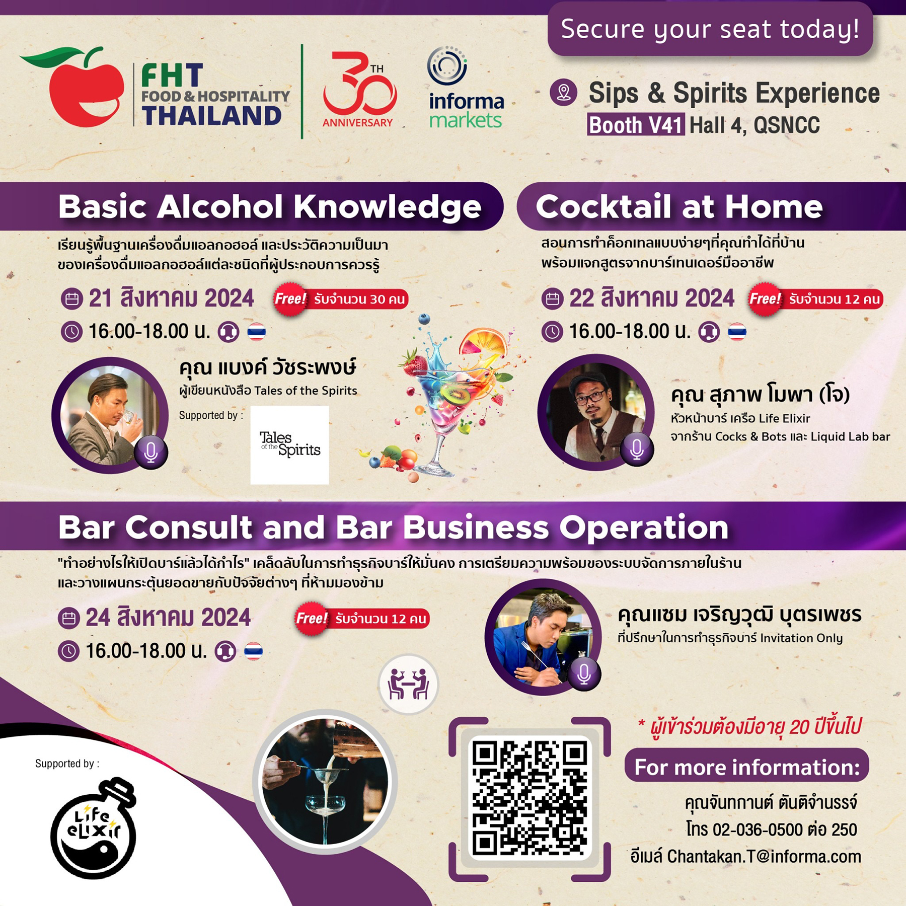 - Bar Consult and Bar Business Operation เวลา 16.00-18.00 น. เคล็ดลับทำอย่างไรให้เปิดบาร์แล้วได้กำไร เรียนรู้ตั้งแต่การเตรียมความพร้อมระบบจัดการภายในร้านและวางแผนกระตุ้นยอดขาย รวมถึงปัจจัยแวดล้อมที่ห้ามมองข้าม โดยคุณแซม เจริญวิฒิ บุตรเพชร ที่ปรึกษาในการทำธุรกิจบาร์ Invitation Only เข้าร่วมการอบรมได้ฟรี (รับจำนวนจำกัด 12 ที่นั่ง)