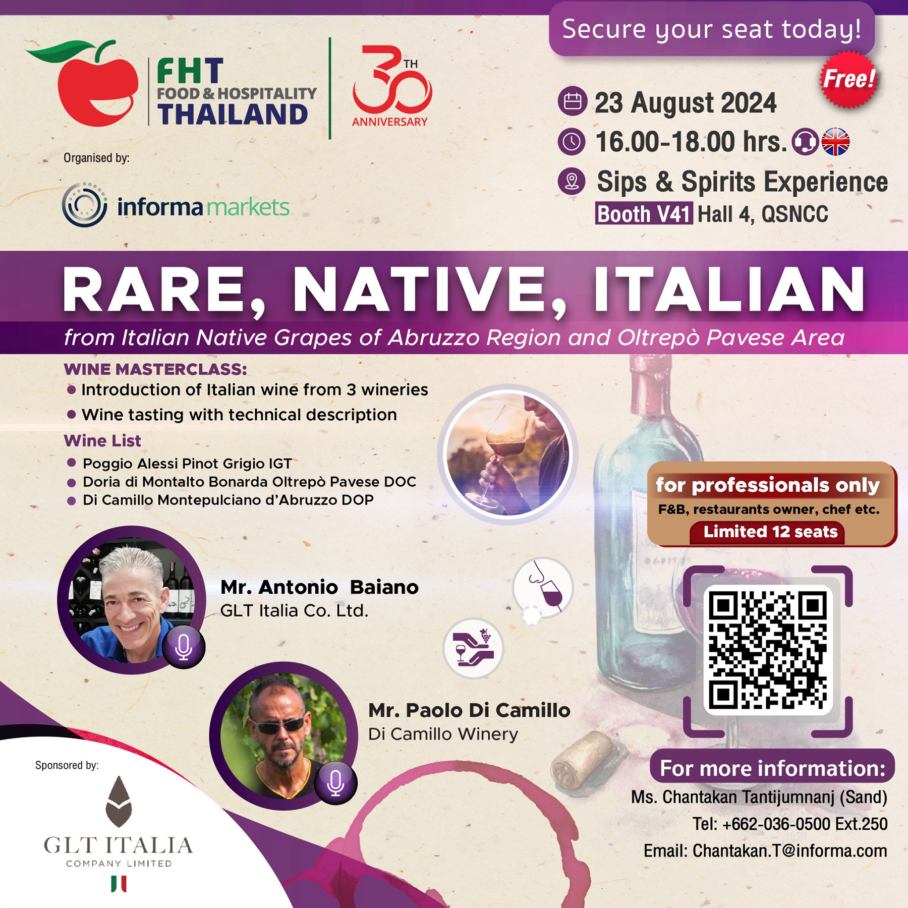 - “Rare, Native, Italian” Introduce of Wine from Italian Native Grapes of Abruzzo Region and Oltrepò Pavese Area เวลา 16.00-18.00 น. กิจกรรมเปิดโลกไวน์อิตาลี เรียนรู้ประวัติความเป็นมา พันธ์องุ่นและไร่องุ่น รสชาติ พร้อมชิมไวน์ชั้นเยี่ยมจากภูมิภาค อาบรุซโซ (Abruzzo) และโอเครโป้ ปาเวเซ่ (Oltrepò Pavese) จาก 3 โรงบ่มชั้นนำ Di Camillo, Poggio di Alessi และ Doria di Montalto. โดย Antonio Baiano, GLT Italia Co. Ltd. และ Mr.Paolo Di Camillo, Di Camillo Winery เข้าร่วมการอบรมได้ฟรี (รับจำนวนจำกัด 12 ที่นั่ง เฉพาะผู้ประกอบการด้านอาหารและเครื่องดื่มเท่านั้น)