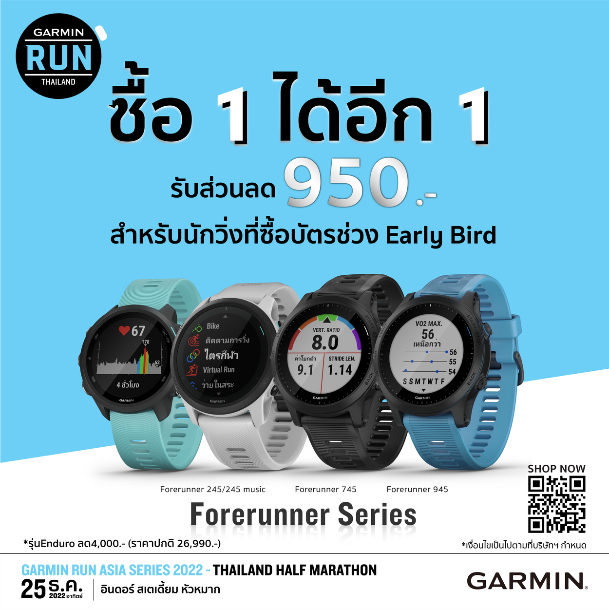 สำหรับผู้ที่สนใจสามารถลงทะเบียนเข้าร่วมงานได้แล้วตั้งแต่วันนี้ – 30 พฤศจิกายน 2565 ผ่านช่องทาง https://bit.ly/3xqvEgI พิเศษสุดสำหรับผู้ที่ลงทะเบียนตั้งแต่วันนี้ – 9 ตุลาคม จะได้รับสิทธิ์ Early Birds ในโปร “ซื้อ 1 ได้อีก 1” รับส่วนลดค่าบัตรมูลค่า 100 บาท พร้อมรับส่วนลดสูงสุดถึง 950 บาทในการซื้อสมาร์ทวอทช์ Garmin หลากหลายรุ่น อาทิ Forerunner รุ่น 245 รุ่น 745 และรุ่น 945 ติดตามข้อมูลเพิ่มเติมได้ที่เฟซบุ๊กเพจ Garmin Thailand