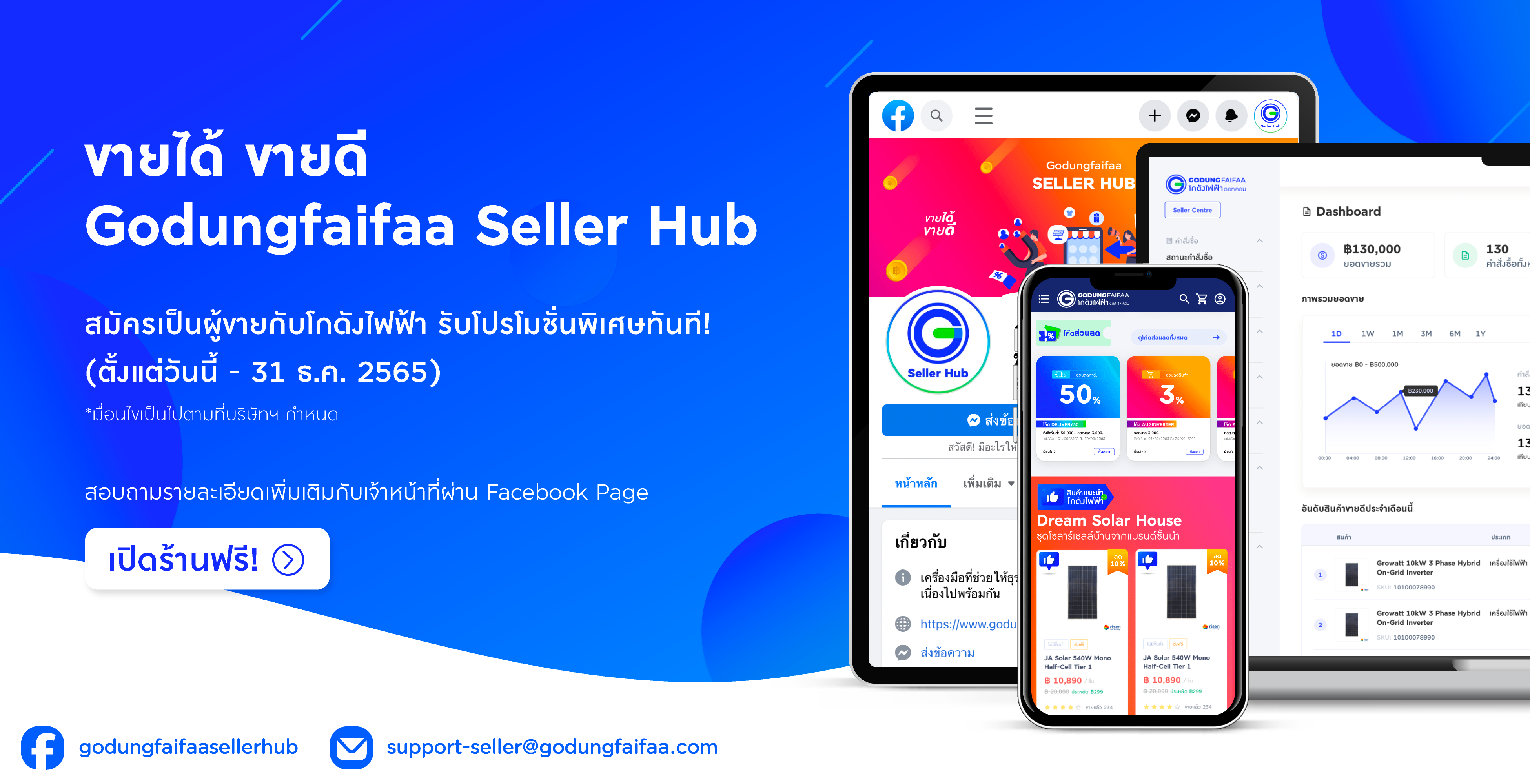 ปัจจุบัน Godungfaifaa Seller Hub พร้อมใช้งานเป็นที่เรียบร้อยแล้ว โดยแพลตฟอร์มมอบส่วนลดคิดค่าธรรมเนียมเพียง 1 บาทต่อบิลเป็นระยะเวลา 3 เดือนสำหรับ 50 ร้านค้าแรกที่เข้าร่วม สนใจทราบรายละเอียดเพิ่มเติม ติดต่อเจ้าหน้าที่ดูแลบัญชีร้านค้าหรือฝ่ายสนับสนุนเทคนิค
