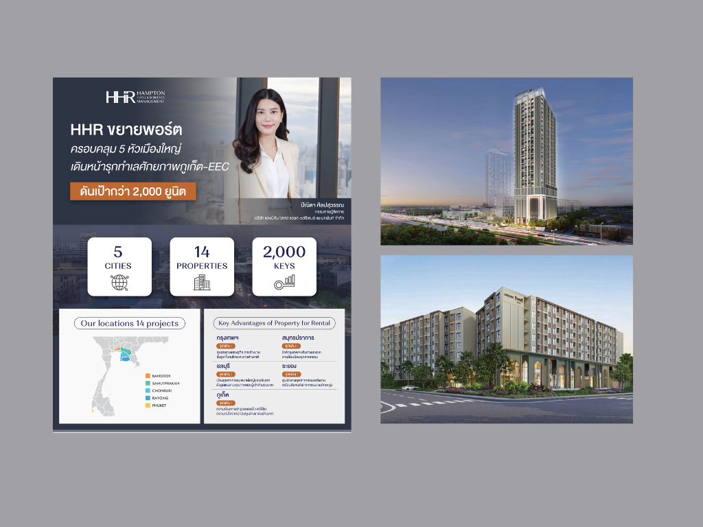 นางสาวปีณิตา ศิลปสุวรรณ กรรมการผู้จัดการ บริษัท แฮมป์ตัน โฮเทล แอนด์ เรสซิเดนซ์ แมเนจเม้นท์ จำกัด หรือ HHR กลุ่มธุรกิจบริหารจัดการอสังหาริมทรัพย์กลุ่มงาน Living Service ในเครือบริษัท พรีโม เซอร์วิส โซลูชั่น จำกัด (มหาชน) หรือ PRI เปิดเผยว่า HHR เป็นกลุ่มธุรกิจกลางน้ำ (Living Services) ที่ให้บริการที่เกี่ยวกับการอยู่อาศัยและการใช้ชีวิตหลังจากโครงการแล้วเสร็จ โดยเฉพาะการให้บริหารจัดการ Residential Property และ Service Apartment ปัจจุบัน HHR ได้ขยายพอร์ตโฟลิโอเดิมที่รับบริหารอยู่ 10 โครงการ เพิ่มเป็น 14 โครงการในไตรมาส 1/2569 นี้ ทำให้มีจำนวนห้องพักรวมกว่า 2,000 ยูนิต ครอบคลุม 5 เมืองใหญ่ในพื้นที่เศรษฐกิจและการท่องเที่ยวเที่ยวทั้งในกรุงเทพฯ, สมุทรปราการ, ชลบุรี, ระยอง และภูเก็ต