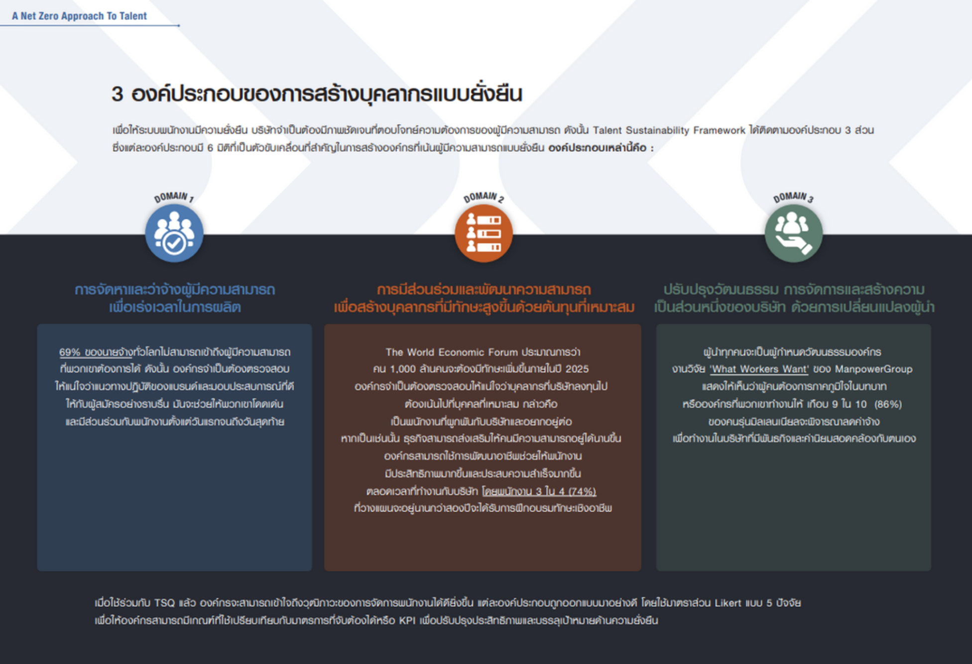 โดยล่าสุด ทาเลนท์ โซลูชันส์ (Talent Solutions) หนึ่งในแบรนด์ของแมนพาวเวอร์กรุ๊ป ที่มีความเชี่ยวชาญด้านการจัดการอาชีพ ด้านนวัตกรรมการแก้ปัญหา และกลยุทธ์การสร้างแรงงานคุณภาพแบบครบวงจรระดับโลก ที่ขับเคลื่อนด้วยข้อมูลตลอดวงจรชีวิตพนักงาน ตั้งแต่ ‘การจัดหา การจัดการ การพัฒนา และการรักษา’ ได้พัฒนากรอบการทำงาน ที่ช่วยให้ธุรกิจวัดผล ปรับปรุง และติดตามแนวทางปฏิบัติด้านบุคลากรที่มีความสามารถของตน เทียบกับผู้ที่มีความสำคัญต่อการเป็นองค์กรที่เน้นความสามารถ นั้นคือ Talent Sustainability Framework ซึ่งสามารถให้ข้อมูลเชิงลึก และแนวทางแก้ไขที่จำเป็นในการจัดลำดับความสำคัญ และพัฒนาแผนกลยุทธ์ในการดึงดูด และการบริหารจัดการบุคลากรที่มีความสามารถได้อย่างยั่งยืน และเพื่อเปรียบเทียบแนวทางปฏิบัติด้านความยั่งยืนของบุคลากรที่มีความสามารถ องค์กรต่าง ๆ สามารถกรอก Talent Sustainability Quotient (TSQ) ที่ได้รับการพัฒนาโดยผู้เชี่ยวชาญของ Talent Solutions จากประสบการณ์หลายปีในด้าน Business Intelligence ที่แข็งแกร่งจากการทำงานร่วมกับองค์กรระดับโลก ผนวกกับการทำงานโดยตรงกับลูกค้า องค์ความรู้นี้ถูกรวมเข้ากับฐานหลักฐานในวงกว้างที่นำมาจากการปฏิบัติงานด้านทรัพยากรบุคคล ซึ่งสามารถประเมินประสิทธิภาพการทำงานของพวกเขาใน 3 องค์ประกอบหลัก แต่ละองค์ประกอบมี 6 มิติที่เป็นตัวขับเคลื่อนหลัก ประกอบด้วย