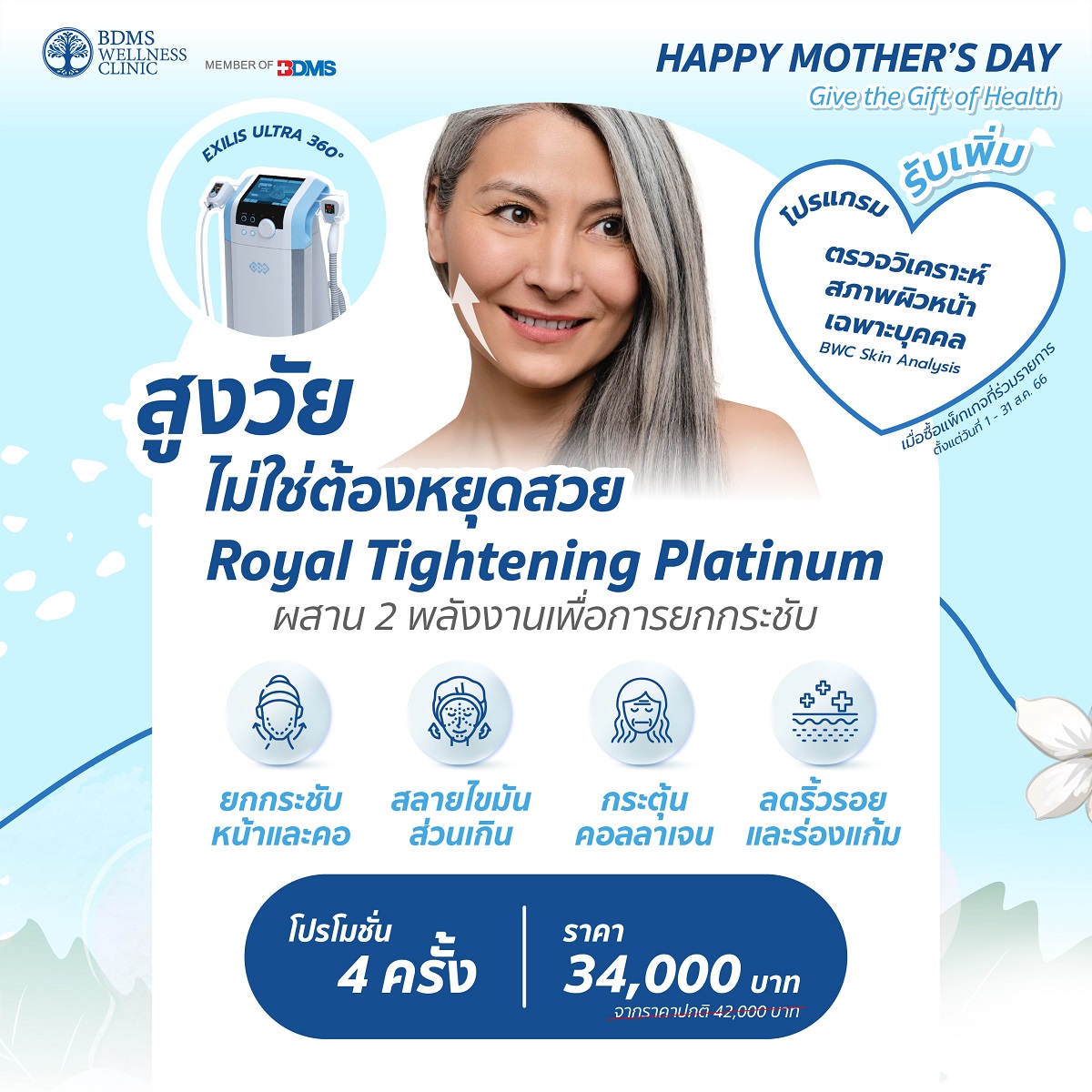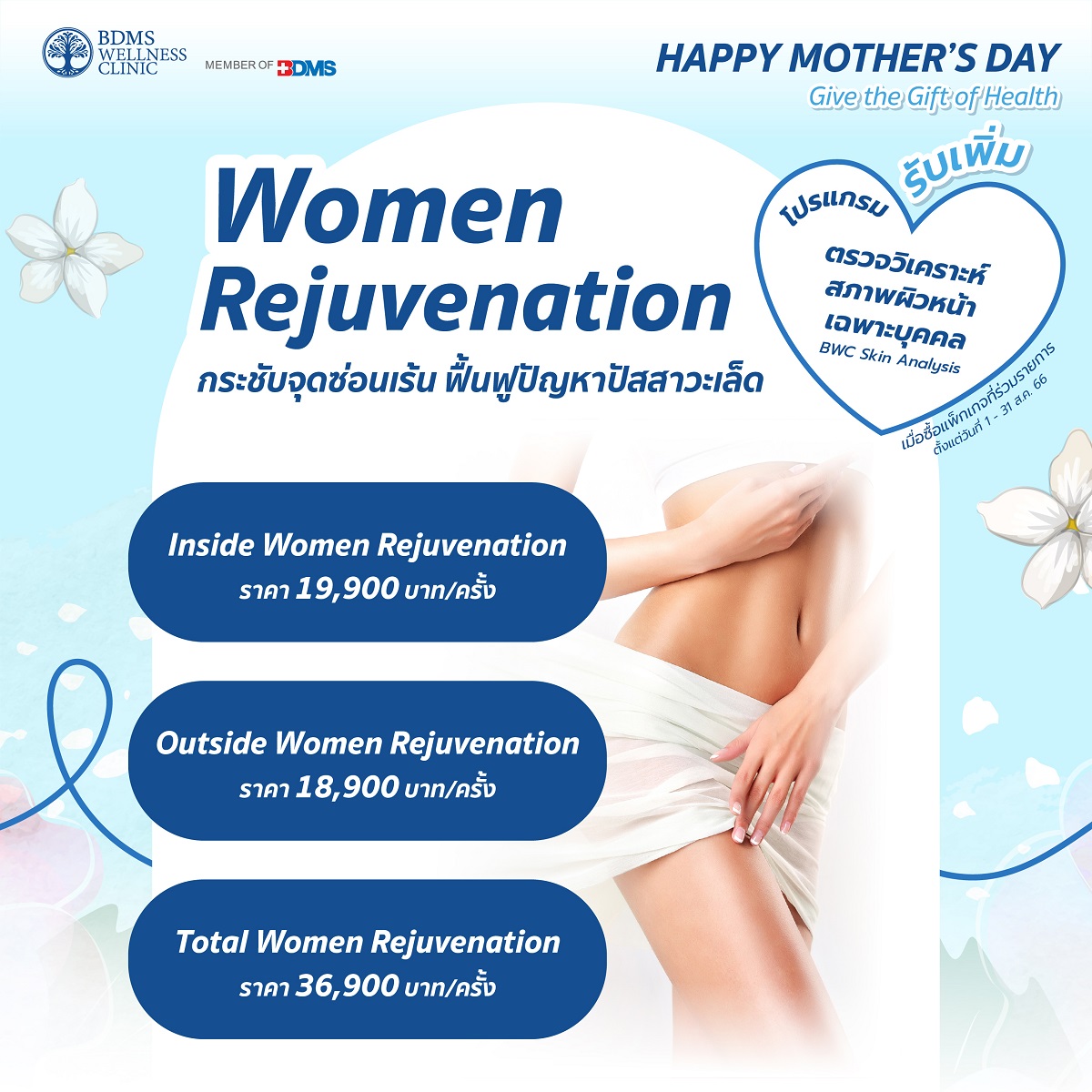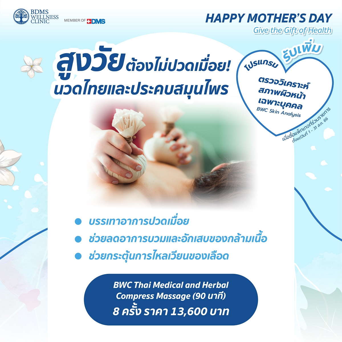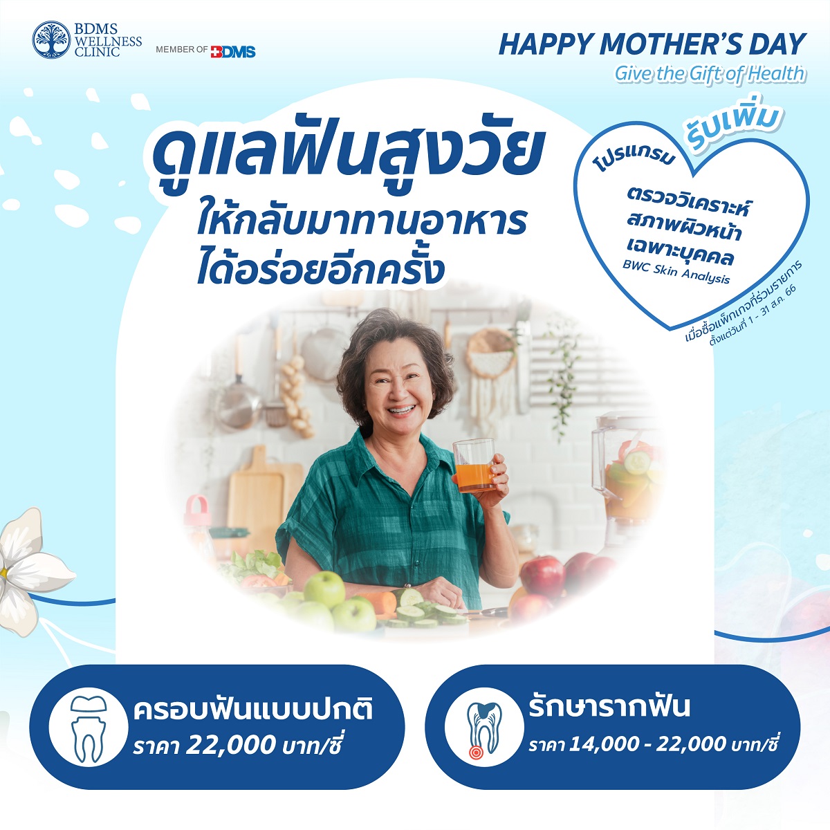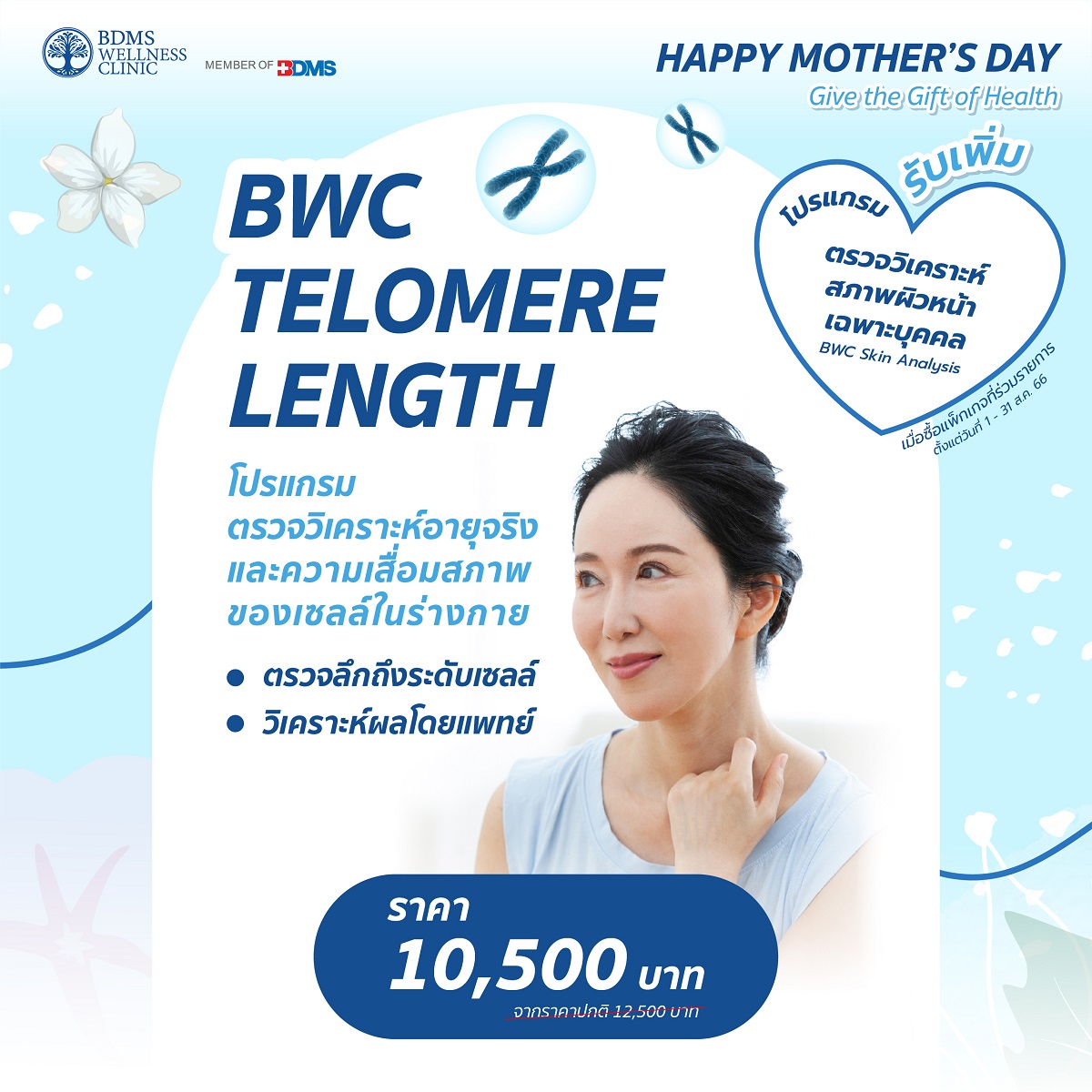 ปีนี้… มีของขวัญวันแม่สุดพิเศษให้กับคุณแม่ที่คุณรักกันรึยัง? บอกรักแม่ด้วยโปรแกรมเพื่อสุขภาพ จาก BDMS Wellness Clinic เชิญชวนคุณแม่และครอบครัวที่คุณรักมาตรวจสุขภาพกับแพ็กเกจที่ร่วมรายการ พร้อมรับทันที คูปองตรวจวิเคราะห์สภาพผิวหน้า (BWC Skin Analysis) มูลค่า 1,200 บาท เมื่อซื้อโปรแกรมที่ร่วมรายการ ตั้งแต่วันที่ 1 – 31 สิงหาคม 2566 อาทิ