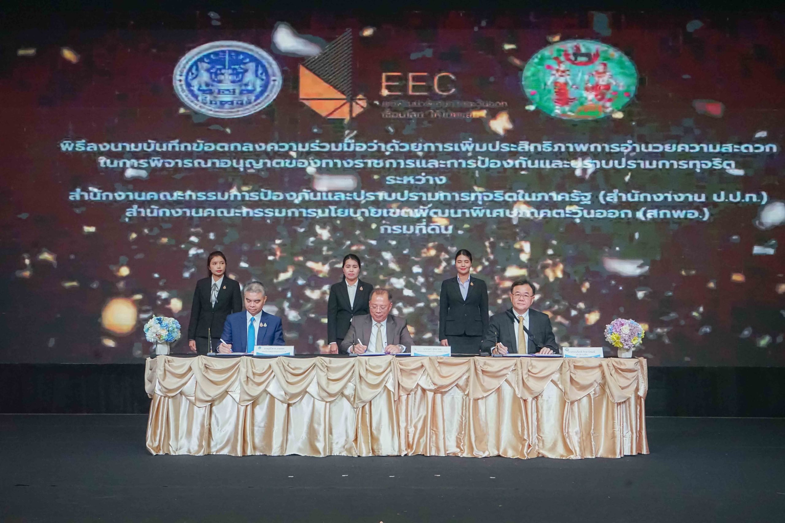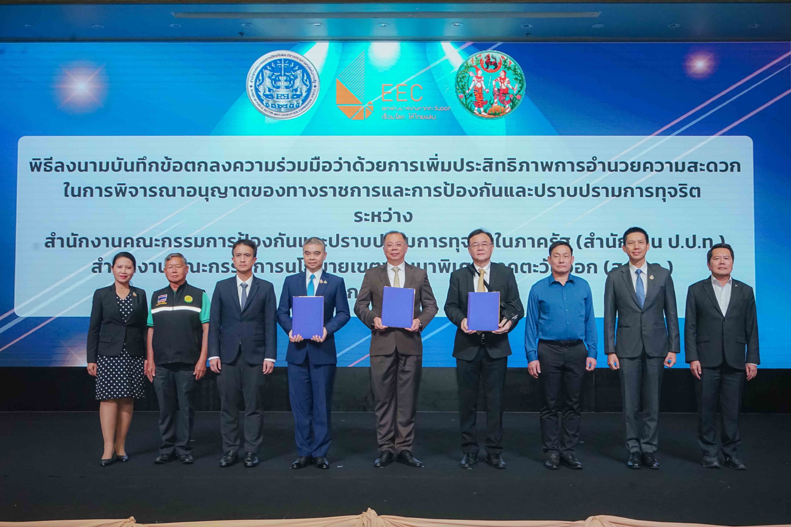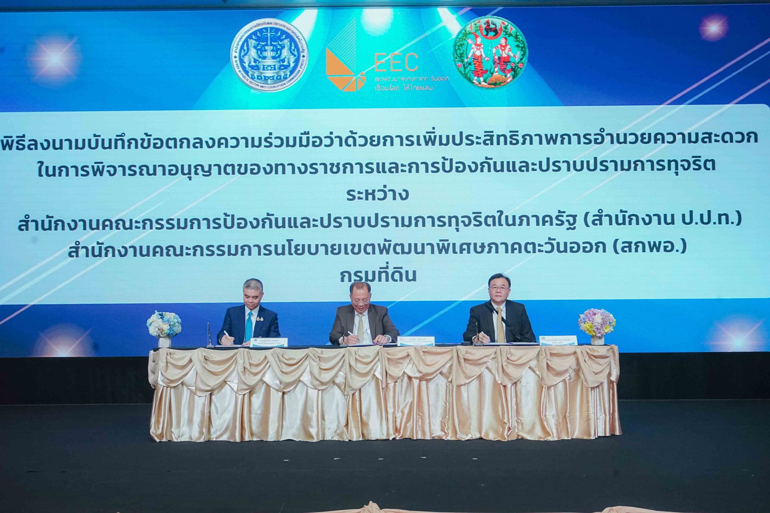 นายจุฬา สุขมานพ เลขาธิการคณะกรรมการนโยบายเขตพัฒนาพิเศษภาคตะวันออก (สกพอ.) พร้อมด้วย นายภูมิวิศาล เกษมศุข เลขาธิการคณะกรรมการป้องกันและปราบปรามการทุจริตในภาครัฐ (ป.ป.ท.) และ นายขจรเกียรติ รักพานิชมณี อธิบดีกรมที่ดิน กระทรวงมหาดไทย ร่วมกันลงนามบันทึกข้อตกลงความร่วมมือ (MOU) ว่าด้วย “การเพิ่มประสิทธิภาพการอำนวยความสะดวกในการพิจารณาอนุญาตของทางราชการและการป้องกันและปราบปรามการทุจริต” ซึ่งเป็นการลงนาม MOU สร้างความร่วมมือระหว่าง 3 หน่วยงาน ได้แก่ สกพอ. สำนักงาน ป.ป.ท. และกรมที่ดิน กระทรวงมหาดไทย และเป็นส่วนหนึ่งของ “การประชุมเชิงปฏิบัติการเพื่อสร้างการรับรู้ ความรู้ ความเข้าใจและรับฟังความคิดเห็น เพื่อจัดทำแนวทาง/มาตรการในการขับเคลื่อนเพื่อยกระดับการให้บริการภาครัฐ”จัดโดยสำนักงาน ป.ป.ท. โดยมีคณะผู้บริหารจากหน่วยงานที่เกี่ยวข้อง ตลอดจนเครือข่ายภาครัฐ ภาคเอกชน และภาคประชาสังคม รวมทั้งสิ้น 250 คน เข้าร่วมเป็นสักขีพยาน ณ โรงแรมแกรนด์ พาลาซโซ่ พัทยา จังหวัดชลบุรี