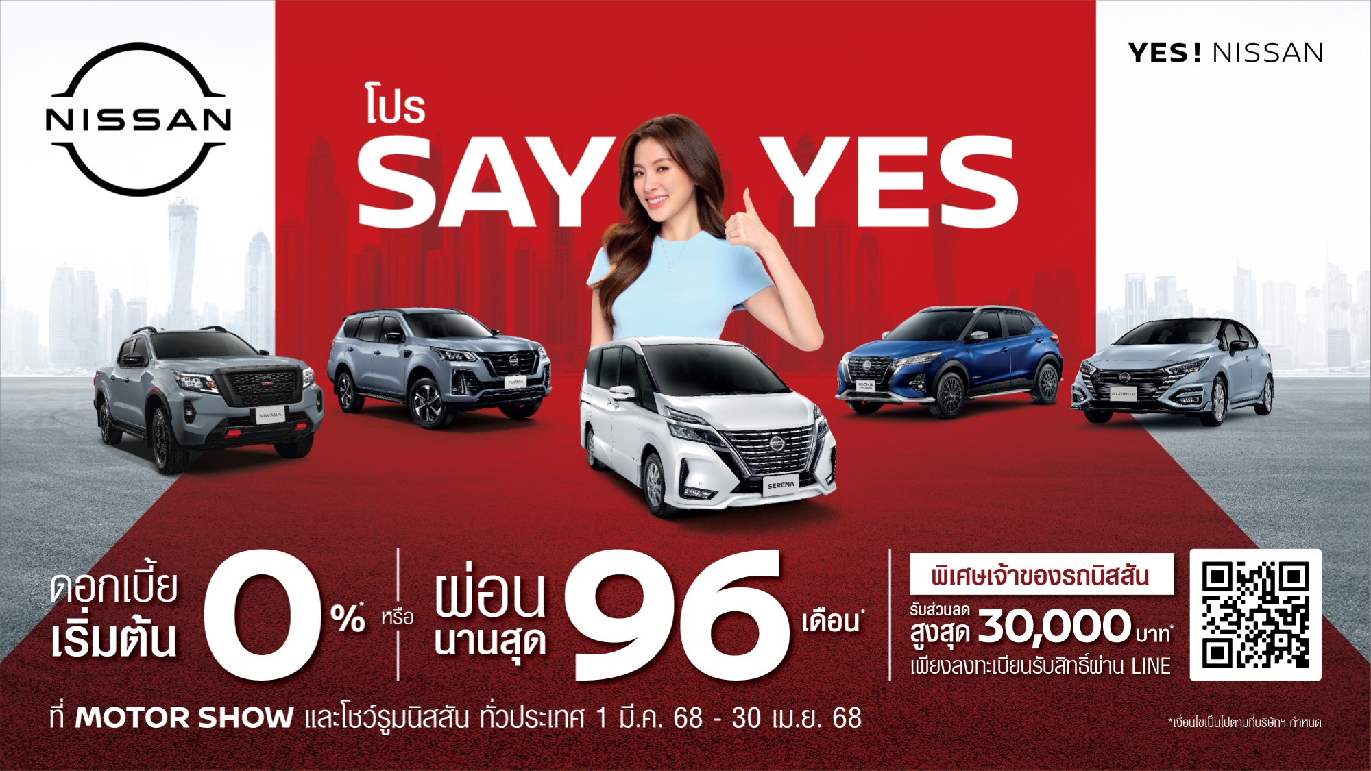 นิสสัน ยังได้เตรียมโปรโมชั่นพิเศษที่จะทำให้ลูกค้าเป็นเจ้าของรถยนต์คุณภาพเยี่ยมได้ง่ายขึ้นกับแคมเปญ SAY YES! ที่มีความหลากหลายให้ลูกค้าเลือกได้อย่างเหมาะสมกับความต้องการของตนเอง ตั้งแต่ดอกเบี้ยพิเศษ 0% ไปจนถึงผ่อนนานสูงสุด 96 เดือน รวมถึงส่วนลดพิเศษสำหรับเจ้าของรถนิสสัน สูงสุด 30,000 บาท