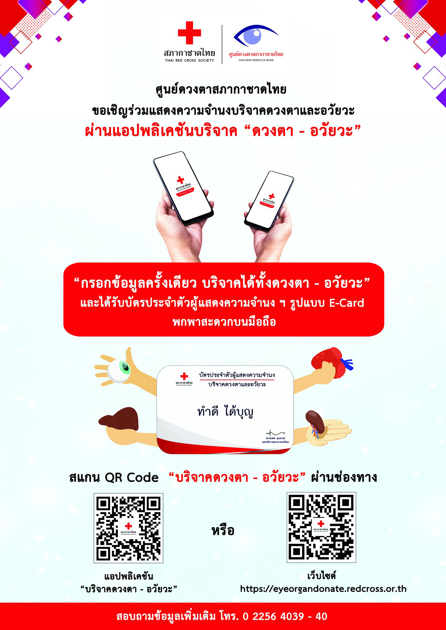 สำหรับผู้ที่สนใจสามารถร่วมแสดงความจำนงบริจาคดวงตาให้แก่สภากาชาดไทย ได้ 2 ช่องทาง ดังนี้ แอปพลิเคชัน “บริจาคดวงตา – อวัยวะ” และ เว็บไซต์ https://eyeorgandonate.redcross.or.th