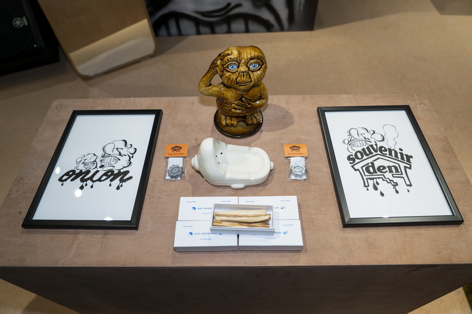 Onion x Den Souvenir” กับไอเทมดีไซน์ ของแต่งบ้าน ของที่ระลึก  และไฮไลท์โปรดักดีไซน์กวนอย่าง Den Ceramic Fountain นี่ค่อนข้างได้รับความนิยมและขายดีมาก ต้นแบบมาจากชิ้นงานศิลปะโถส้วมผู้ชายของศิลปิน Marcel Duchamp ทำด้วยมือโดยช่างฝีมือทีละชิ้น จะใช้เป็นที่เขี่ยบุหรี่หรือวางธูปหอมก็ได้ตามชอบ และยังสินค้าอื่นๆ อีกมากมายที่ควรค่าแก่การสะสม
