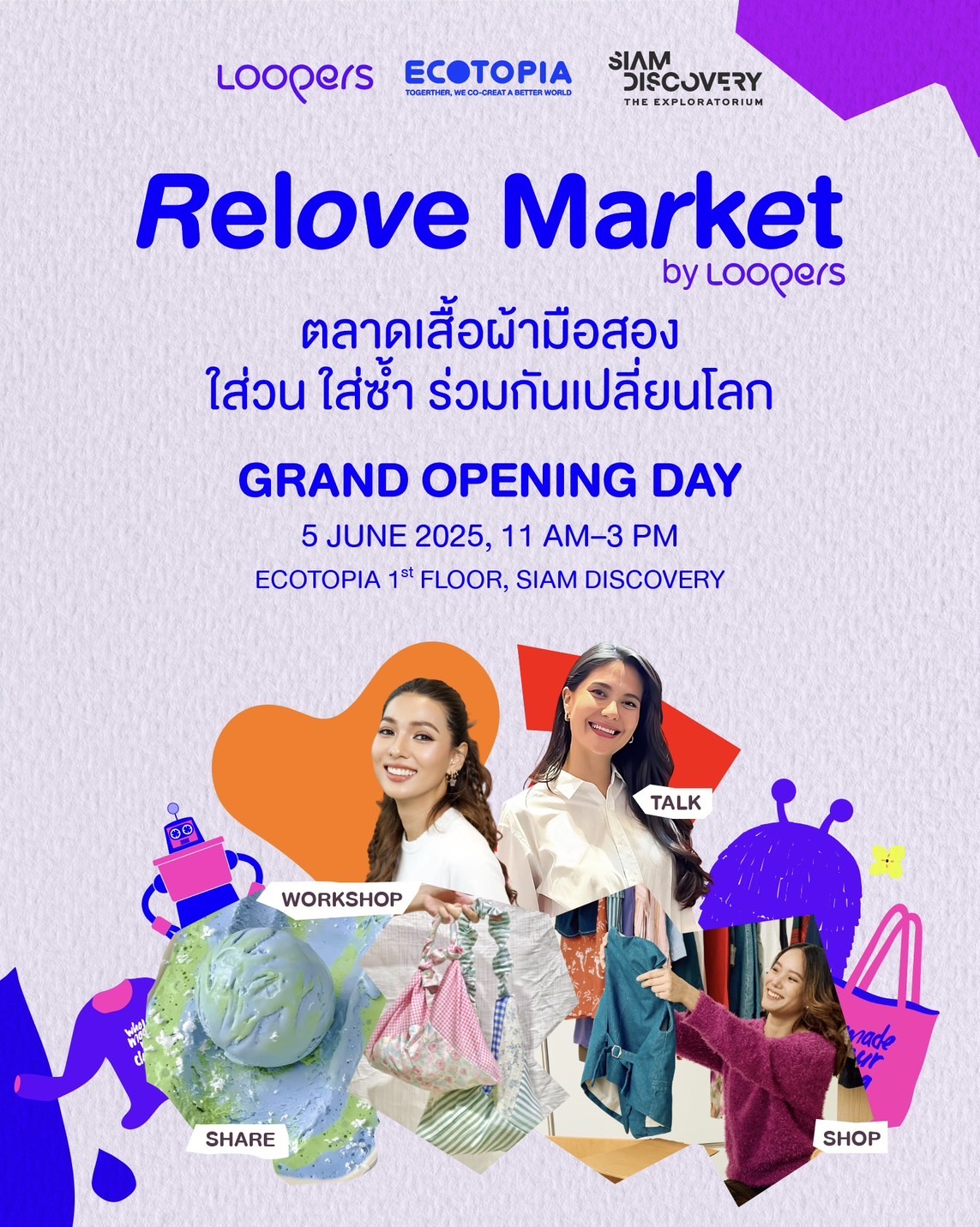 นอกจากนี้ ECOTOPIA เมืองแห่งคนรักโลก ร่วมกับ “Loopers” (ลูปเปอร์ส) แพลตฟอร์มออนไลน์สำหรับซื้อขายเสื้อผ้ามือสอง จัดกิจกรรม “Relove Market by Loopers” ตลาดเสื้อผ้ามือสอง ใส่วน ใส่ซ้ำร่วมกันเปลี่ยนโลก พบกับกิจกรรมเปิดตู้เสื้อผ้ามือสอง เพื่อการส่งต่อเสื้อผ้ามือสองแต่คุณภาพดี และเพื่อสร้างความยั่งยืน พร้อมพบกับกิจกรรมทอล์คเรื่องการใช้ชีวิตรักโลกที่สนุก และทำได้ง่ายในทุกๆวัน โดยมารีญา พูลเลิศลาภ miss universe thailand 2017, ใบตอง-จรีรัตน์ เพชรโสม Miss Earth Thailand 2021 และเกด-พิชามาศ ชัยงาม Co-Founder loopers พร้อมด้วยกิจกรรมเย็บกระเป๋าจากเสื้อผ้าเหลือใช้ให้เป็นใบเดียวในโลก ในวันที่ 5 มิถุนายน 2568 ณ ชั้น 1 ECOTOPIA สยามดิสคัฟเวอรี่