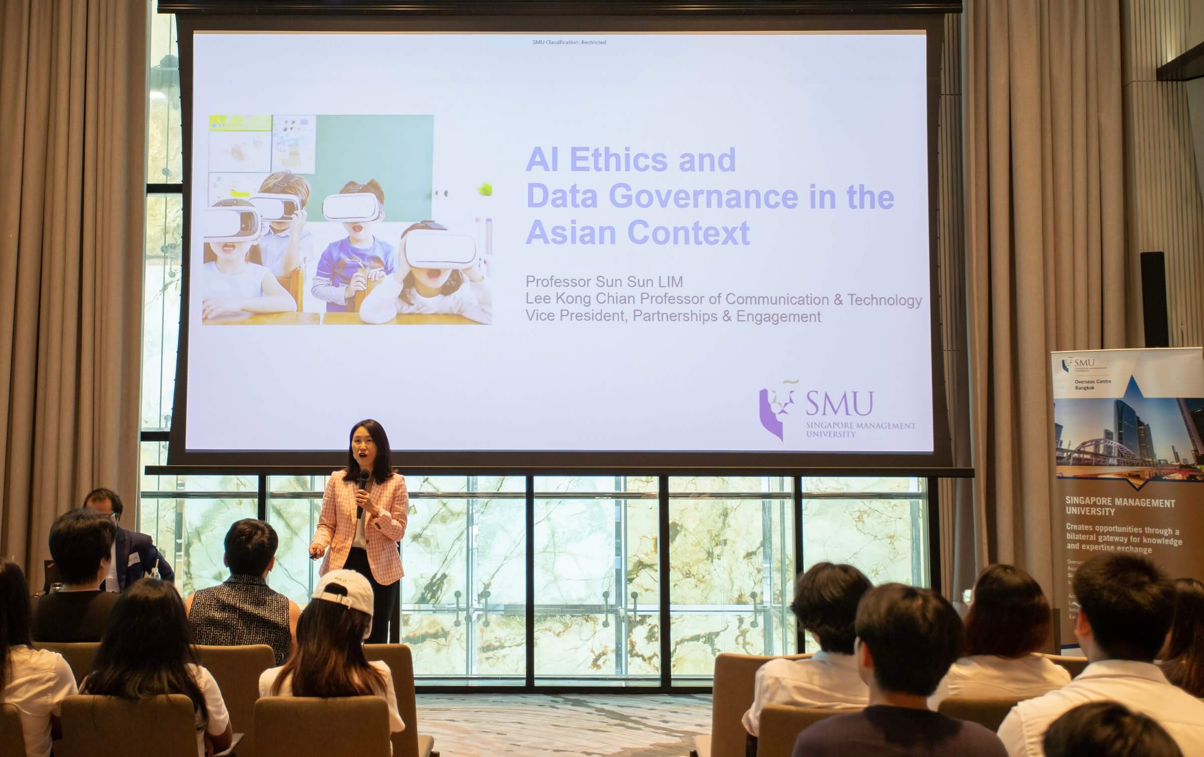 ในงานครั้งนี้ ศาสตราจารย์ ซัน ซัน ลิม (Sun Sun Lim) รองอธิการบดีฝ่ายความสัมพันธ์และการมีส่วนร่วม และศาสตราจารย์ด้านการสื่อสารและเทคโนโลยี ลีคงเชียน (Lee Kong Chian) จาก SMU ได้ทำการบรรยายพิเศษในหัวข้อ “AI Ethics and Data Governance in the Asian Context” โดยได้กล่าวถึงการเปลี่ยนแปลงทางสังคมที่เนื่องมาจากการพัฒนาเทคโนโลยี อนาคตของการทำงาน และหลักจริยธรรมที่เกี่ยวข้องกับปัญญาประดิษฐ์ (AI) พร้อมเน้นย้ำว่า ประเทศต่างๆ ในภูมิภาคอาเซียนสามารถใช้ AI ให้เป็นประโยชน์และสนับสนุนผู้บริโภคที่มีมากถึง 673 ล้านคนของภูมิภาคนี้ โดยผ่านการจัดตั้งกรอบการกำกับดูแลที่ให้ความสำคัญกับการมีผู้คนเป็นศูนย์กลาง (‎Human-Centric Approach‎)