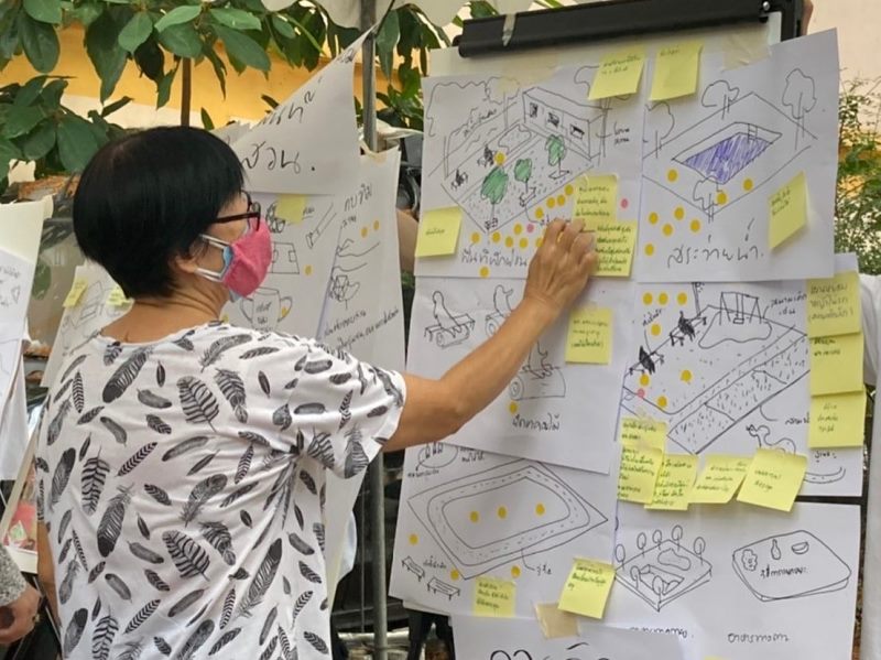 ส่วนประเด็นอื่นๆ ก็น่ารัก ไม่แพ้กัน นอกเหนือจากพื้นที่ปลอดภัย และสวนสาธารณะสำหรับออกกำลังกายแล้ว เด็กๆ อยากได้ พื้นที่สนามเด็กเล่น สระว่ายน้ำกับสัตว์ประหลาดในดวงใจ (คางคกยักษ์) ผู้สูงวัย อยากได้พื้นที่ สวนผักชุมชน พื้นที่ฟังเทศน์ฟังธรรม ฝั่งคนรุ่นใหม่อยากได้พื้นที่ในการนำเสนอศิลปะวัฒธรรมในชุมชน ผ่านงานศิลปะต่างๆ ความคิดเห็นที่ไปในทิศทางเดียวกัน หรือแตกต่างกัน ขึ้นอยู่กับประสบการณ์ของตัวบุคคลจริงๆ ความพร้อม ความไม่พร้อม การลงพื้นที่ชุมชนครั้งนี้ ได้บทเรียนมากมาย โดยเฉพาะลึกซึ้งกับการศึกษาทำความเข้าใจ “พฤติกรรมมนุษย์” มีผลต่อการออกแบบมากมายจริงๆ