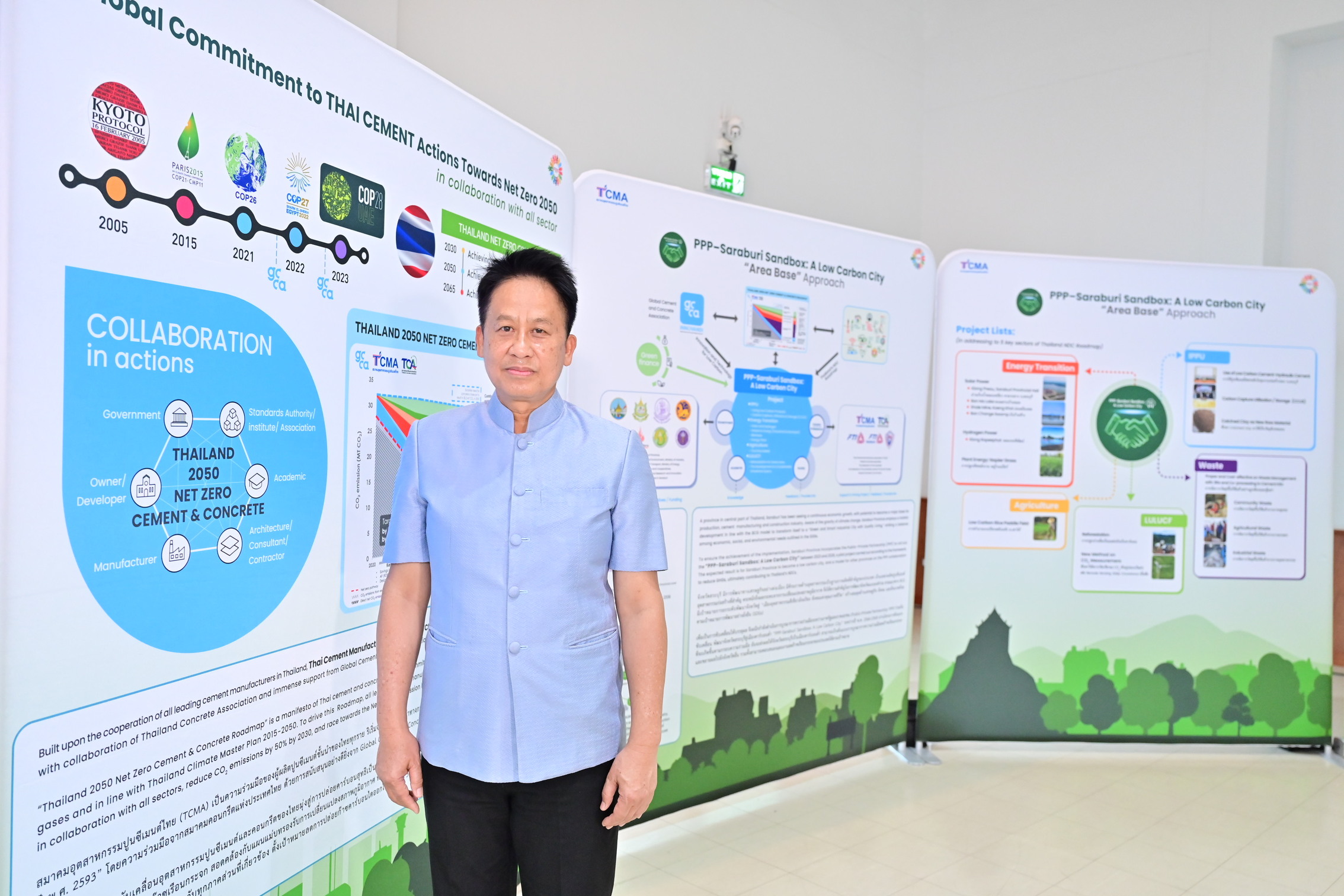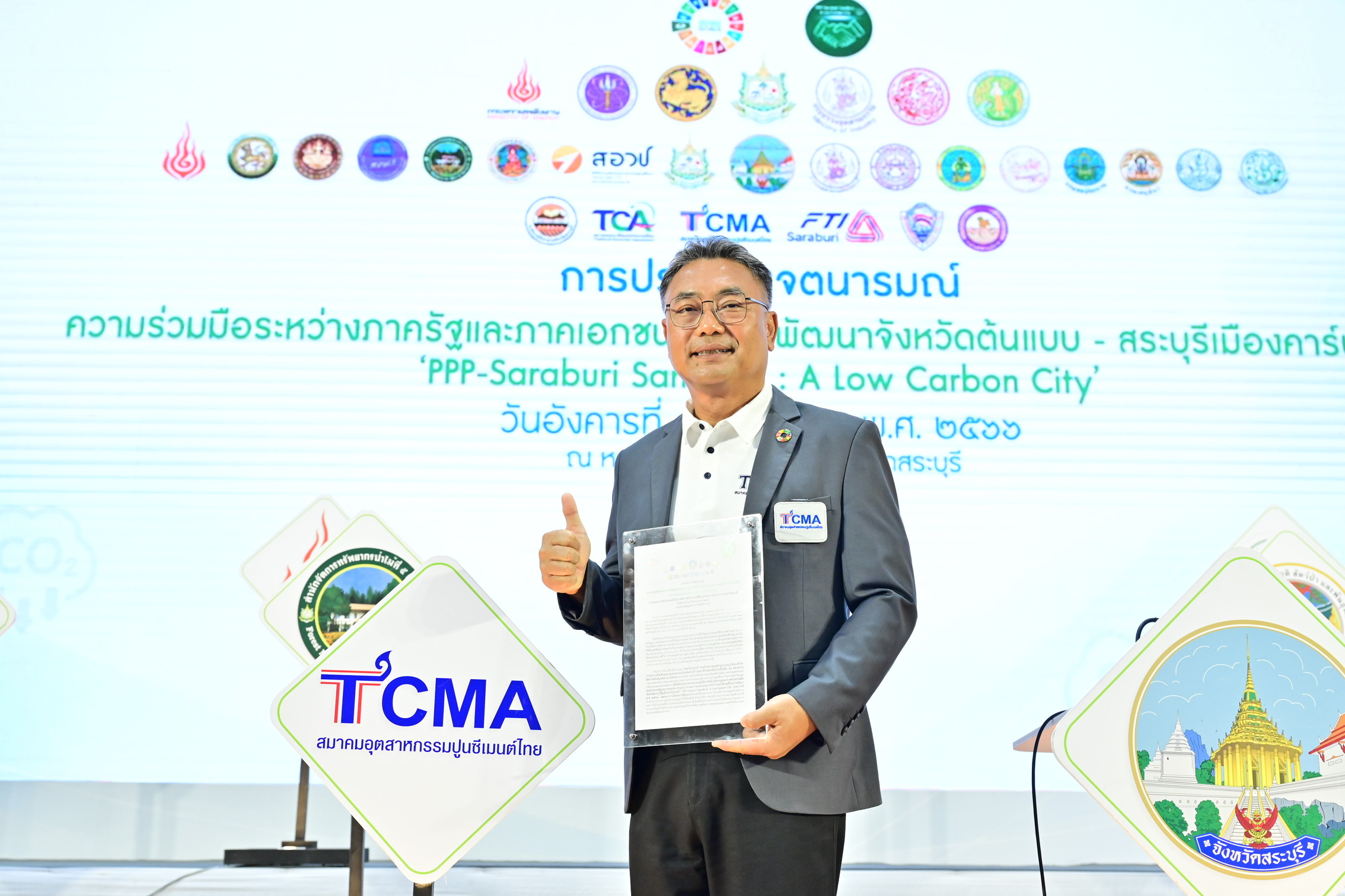 สมาคมอุตสาหกรรมปูนซีเมนต์ไทย (TCMA) และจังหวัดสระบุรี พร้อม 21 หน่วยงาน ประกาศเจตนารมณ์ “ความร่วมมือระหว่างภาครัฐและภาคเอกชน (Public-Private Partnership: PPP) ในการพัฒนาจังหวัดต้นแบบ-สระบุรีเมืองคาร์บอนต่ำ ‘PPP-Saraburi Sandbox: A Low Carbon City’ โดยการสนับสนุนของ 7 กระทรวง เดินหน้าขับเคลื่อนโครงการต้นแบบ ตามสาขา Thailand NDC Roadmap มุ่งสนับสนุนเป้าหมายไทยลดก๊าซเรือนกระจก พร้อมเป็นต้นแบบขยายผลไปจังหวัดอื่น รวมทั้งยกระดับพัฒนาสระบุรีสู่เมืองอุตสาหกรรมสีเขียวอัจฉริยะ สังคมแห่งคุณภาพชีวิต โดยมี ดร. ชนะ ภูมี นายกสมาคมอุตสาหกรรมปูนซีเมนต์ไทย (TCMA) นายผล ดำธรรม ผู้ว่าราชการจังหวัดสระบุรี ดร. กิตติพงค์ พร้อมวงค์ ผู้อำนวยการสำนักงานสภานโยบายการอุดมศึกษา วิทยาศาสตร์วิจัยและนวัตกรรมแห่งชาติ น.อ.ศ.ดร.ธนากร พีระพันธุ์ นายกสมาคมคอนกรีตแห่งประเทศไทย นายปริญญา คุ้มสระพรหม ผู้อำนวยการสำนักงานทรัพยากรธรรมชาติและสิ่งแวดล้อมจังหวัดสระบุรี ฯลฯ เข้าร่วม