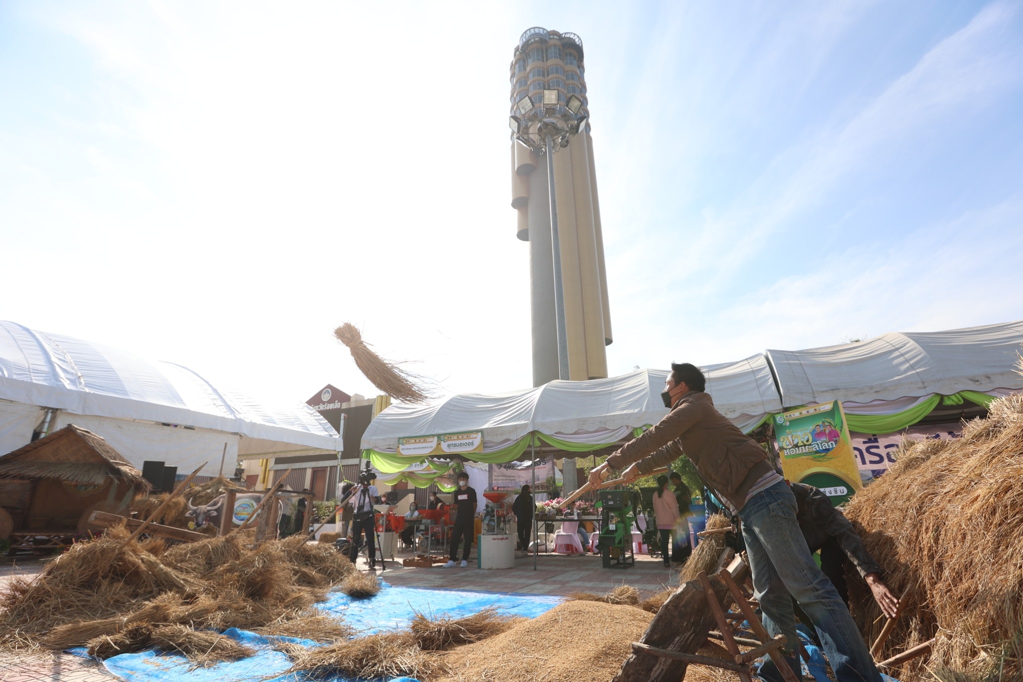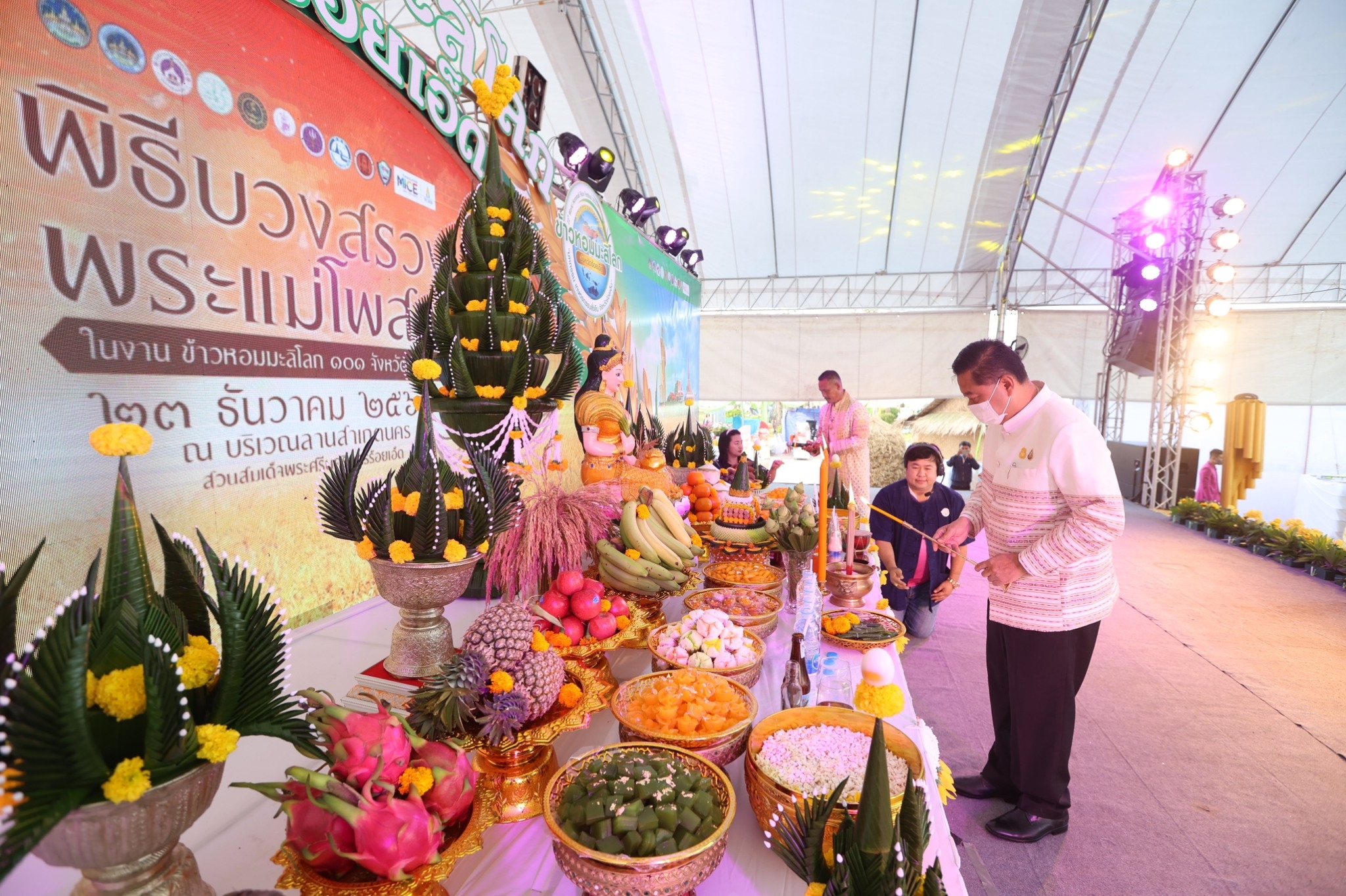 เพราะข้าวมีความผูกพันกับวิถีชีวิตความเป็นอยู่ของคนไทยมาช้านาน (นานกว่า 5,500 ปีเลยนะ) เรากินข้าวเป็นอาหารหลัก นอกจากนั้นข้าวยังใช้เป็นสัญลักษณ์ของความอุดมสมบูรณ์ในพิธีกรรมต่าง ๆ ข้าวมีความผูกพันกับวิถีชีวิตของคนไทยจนแยกไม่ออก เรียกได้ว่าเป็นหนึ่งในอัตลักษณ์ของประเทศไทย ภายในงานครั้งนี้ เราจึงได้อึ้ง ทึ่ง กับ กิจกรรมพิธีบวงสรวงแม่โพสพ ซึ่งเป็นประเพณีปฏิบัติตามความเชื่อ โดยชาวนาทุกคนเชื่อว่าแม่โพสพมีพระคุณต่อชีวิตของชาวนา สืบต่อเนื่องจากรุ่นปู่ย่าตายายมาเป็นระยะเวลาอันยาวนาน