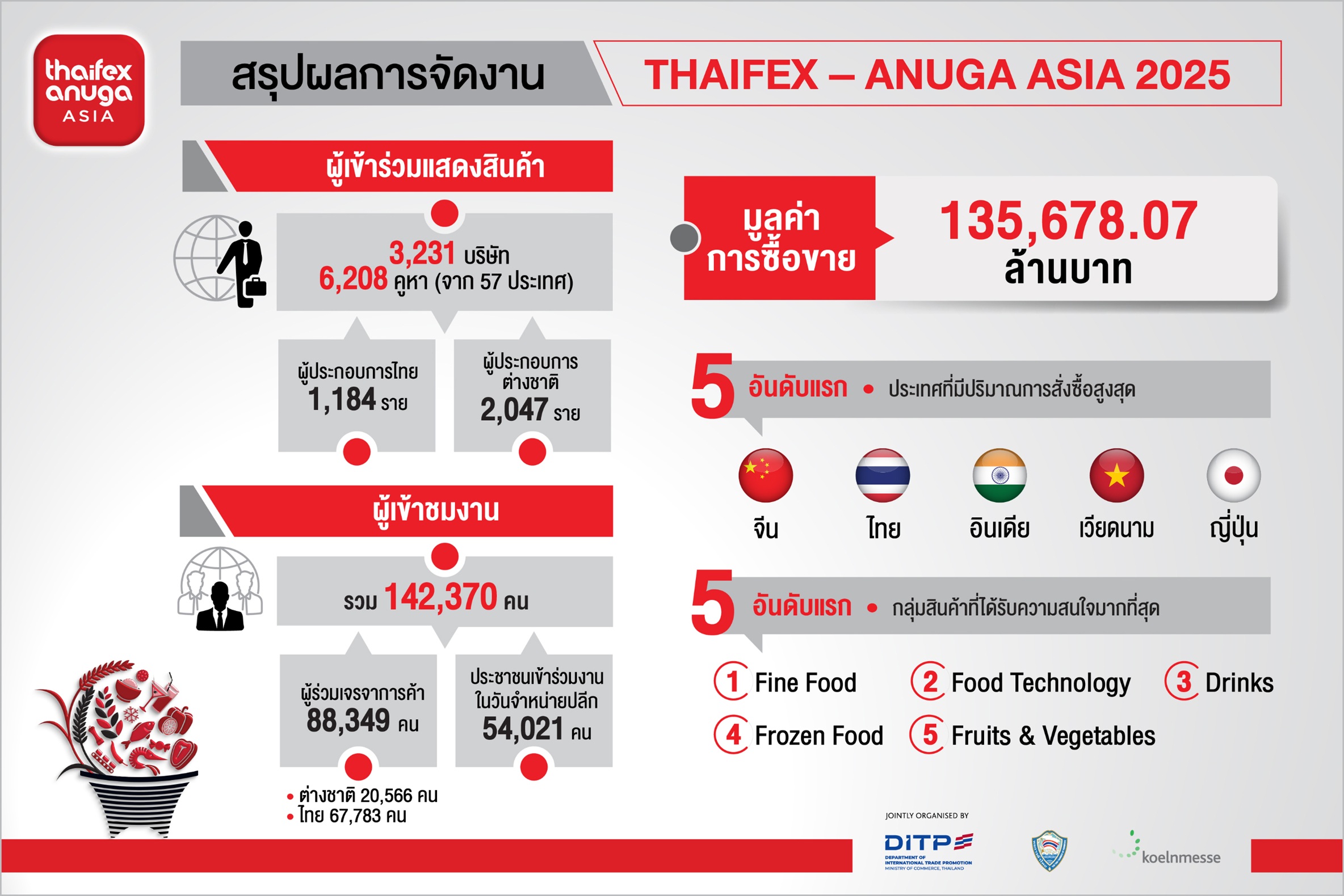 สำหรับประเทศที่มีปริมาณการสั่งซื้อสูงสุด 5 อันดับแรก ได้แก่ จีน ไทย อินเดีย เวียดนาม และญี่ปุ่น ขณะที่โซนสินค้าที่ได้รับความสนใจมากที่สุด ได้แก่ Fine Food, Food Technology, Drinks, Frozen Food และ Fruits & Vegetables