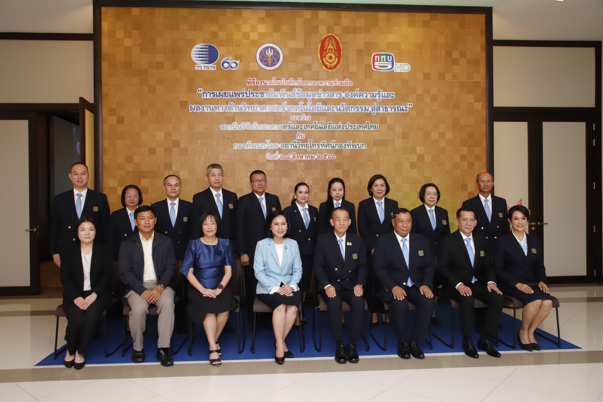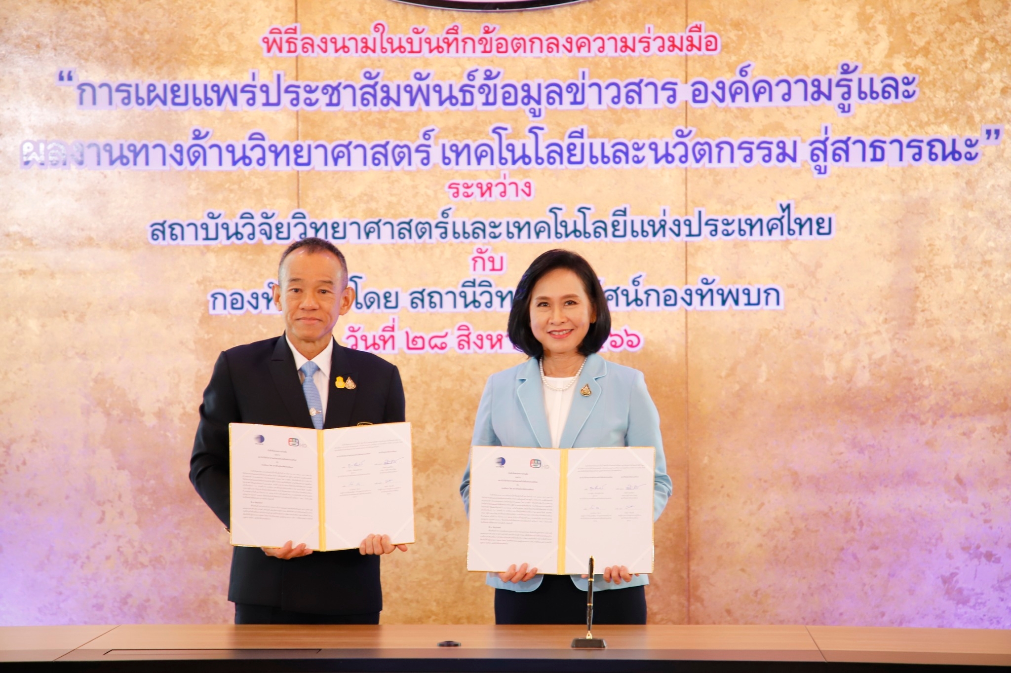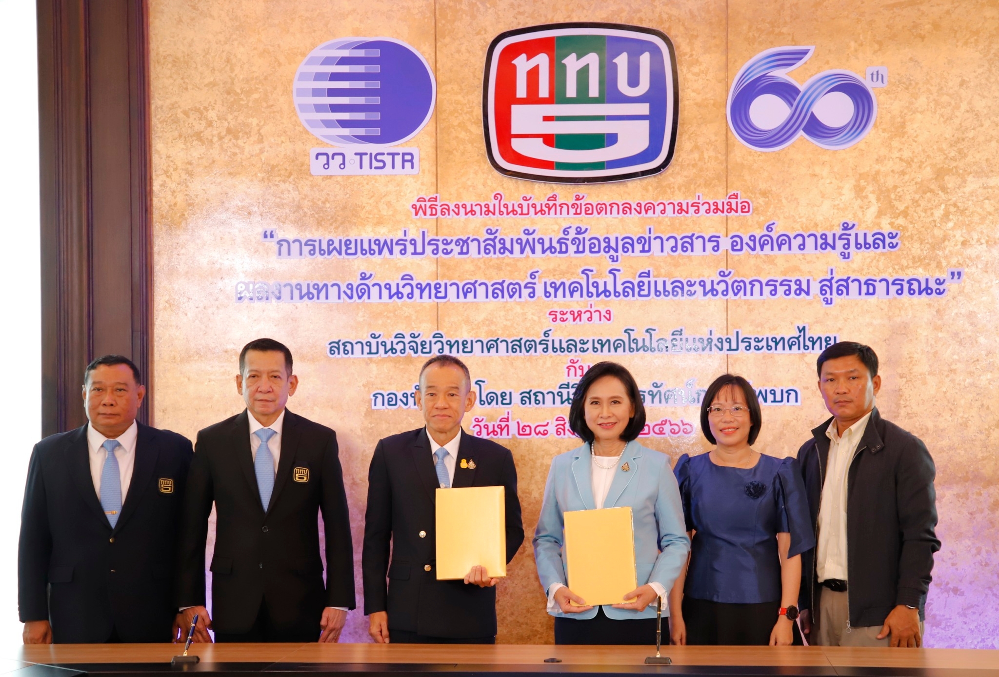ดร.ชุติมา  เอี่ยมโชติชวลิต  ผู้ว่าการ   สถาบันวิจัยวิทยาศาสตร์และเทคโนโลยีแห่งประเทศไทย (วว.) กระทรวงการอุดมศึกษา วิทยาศาสตร์ วิจัยและนวัตกรรม   (อว.)   ลงนามความร่วมมือกับ  พลเอกวิสันติ   สระศรีดา   กรรมการผู้อำนวยการใหญ่  สถานีวิทยุโทรทัศน์กองทัพบก  ช่อง  5   ในฐานะตัวแทนกองทัพบก  เพื่อเสริมสร้างความร่วมมืออย่างบูรณาการในการเผยแพร่ประชาสัมพันธ์ข้อมูลข่าวสาร องค์ความรู้และผลงานทางด้านวิทยาศาสตร์ เทคโนโลยีและนวัตกรรม (วทน.) เพื่อให้เกิดการนำไปใช้ประโยชน์ในวงกว้าง รวมทั้งร่วมกันขับเคลื่อนการดำเนินงานในด้านต่างๆ ที่เกี่ยวข้องกับการพัฒนาและส่งเสริมการตลาด  สร้างความเข้มแข็งให้กับผู้ประกอบการ ชุมชน โอทอป วิสาหกิจรายย่อย และผู้ประกอบการ SMEs  ภายใต้ขอบเขตอำนาจหน้าที่ กฎหมาย ระเบียบ และข้อบังคับของแต่ละฝ่าย  โดยมีระยะเวลาความร่วมมือ 3 ปี  โอกาสนี้ ดร.โศรดา  วัลภา  รองผู้ว่าการวิจัยและพัฒนาด้านอุตสาหกรรมชีวภาพ   วว.  พลโทวสันต์   ทัพวงศ์  และ นางสาวทวินันท์  คงคราญ   รองผู้อำนวยการใหญ่  สายงานปฏิบัติการ  ททบ. 5   พร้อมผู้บริหาร  บุคลากร  ทั้งสองหน่วยงานร่วมเป็นเกียรติ  ในวันที่  28  สิงหาคม  2566  ณ  ห้องประชุม ชั้น 19  อาคารเบญจรังสฤษฏ์  ททบ. 5  สนามเป้า