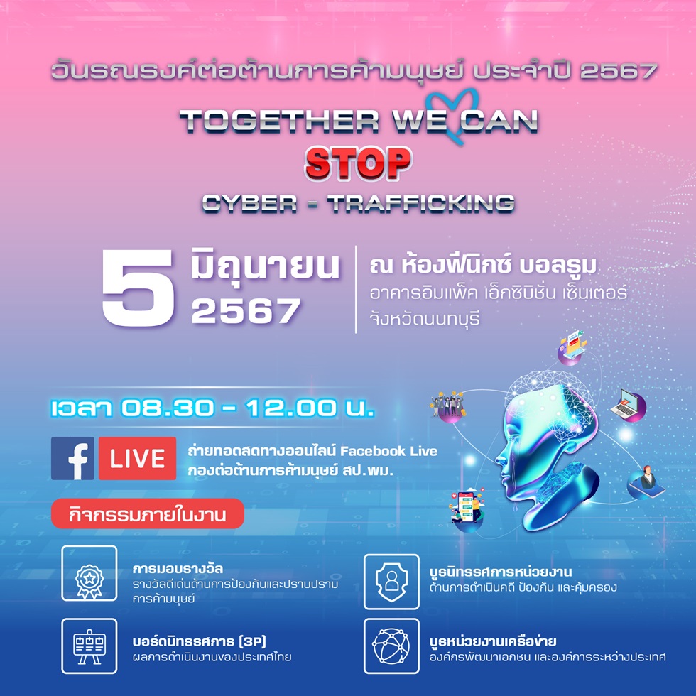 กระทรวงการพัฒนาสังคมและความมั่นคงของมนุษย์ กำหนดจัดงานวันรณรงค์ต่อต้านการค้ามนุษย์ ประจำปี 2567 ในวันพุธที่ 5 มิ.ย. 2567 เวลา 08.30-12.00 น. ณ ห้องฟีนิกซ์ บอลรูม อาคารอิมแพ็ค เอ็กซิบิชั่น เซ็นเตอร์ จังหวัดนนทบุรี และถ่ายทอดสดผ่านทาง Facebook Live กองต่อต้านการค้ามนุษย์ สป.พม. เพื่อแสดงเจตนารมณ์ความมุ่งมั่นของรัฐบาลไทยในการป้องกันและปราบปรามการค้ามนุษย์ให้หมดสิ้นไปจากประเทศไทย หรือ Zero Tolerance รณรงค์เผยแพร่การดำเนินงานต่อต้านการค้ามนุษย์ของประเทศไทย สร้างความรู้ความเข้าใจที่ถูกต้องเกี่ยวกับการต่อต้านการค้ามนุษย์ให้แก่ประชาชน ภาคีเครือข่ายที่เกี่ยวข้องทั้งหน่วยงานภาครัฐส่วนกลาง และส่วนภูมิภาค องค์กรพัฒนาเอกชน องค์การระหว่างประเทศ รวมทั้งสื่อมวลชน เพื่อผนึกกำลังของหน่วยงานที่เกี่ยวข้องของประเทศไทยในการป้องกันและปราบปรามการค้ามนุษย์ให้เห็นเป็นที่ประจักษ์และได้รับการยอมรับในเวทีระดับสากล