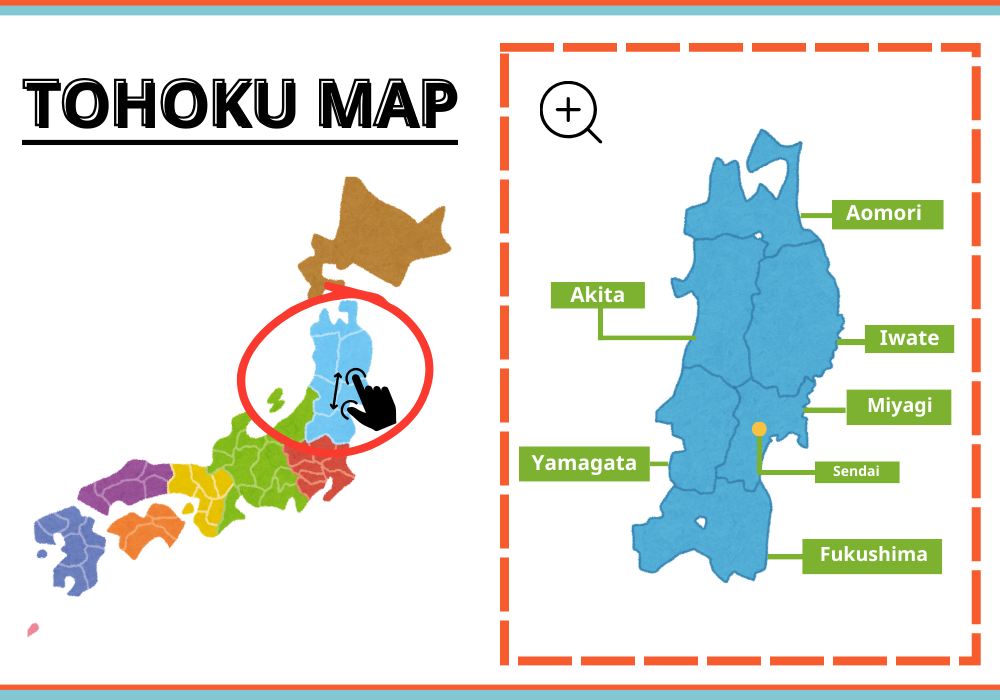 โทโฮคุเป็นภูมิภาคทางตะวันออกเฉียงเหนือของญี่ปุ่นที่ประกอบด้วย 6 จังหวัด ได้แก่ จ.อาโอโมริ จ.อาคิตะ จ.อิวาเตะ จ.ฟุกุชิม่า จ.ยามากาตะ และ จ.มิยางิ โดยมีเมืองเซ็นไดเป็นเมืองหลวงแห่งภูมิภาค ซึ่งแต่ละจังหวัดนั้นกว้างใหญ่มากจนเที่ยวครั้งเดียวก็เวียนได้ไม่หมด! แถมด้วยทำเลที่นั่งชินกันเซ็นจากโตเกียวหรือฮอกไกโดไปถึงได้ง่าย ๆ อีกทั้งมีแหล่งท่องเที่ยวทางธรรมชาติที่สวยงามทุกฤดู วัฒนธรรมที่มีเอกลักษณ์เฉพาะตัว งานเทศกาลยิ่งใหญ่ระดับประเทศ และอาหารท้องถิ่นที่หลากหลาย ทำให้โทโฮคุเป็นแหล่งท่องเที่ยวยอดนิยมสำหรับคนที่อยากสัมผัสญี่ปุ่นแบบท้องถิ่นที่ไม่เหมือนใคร