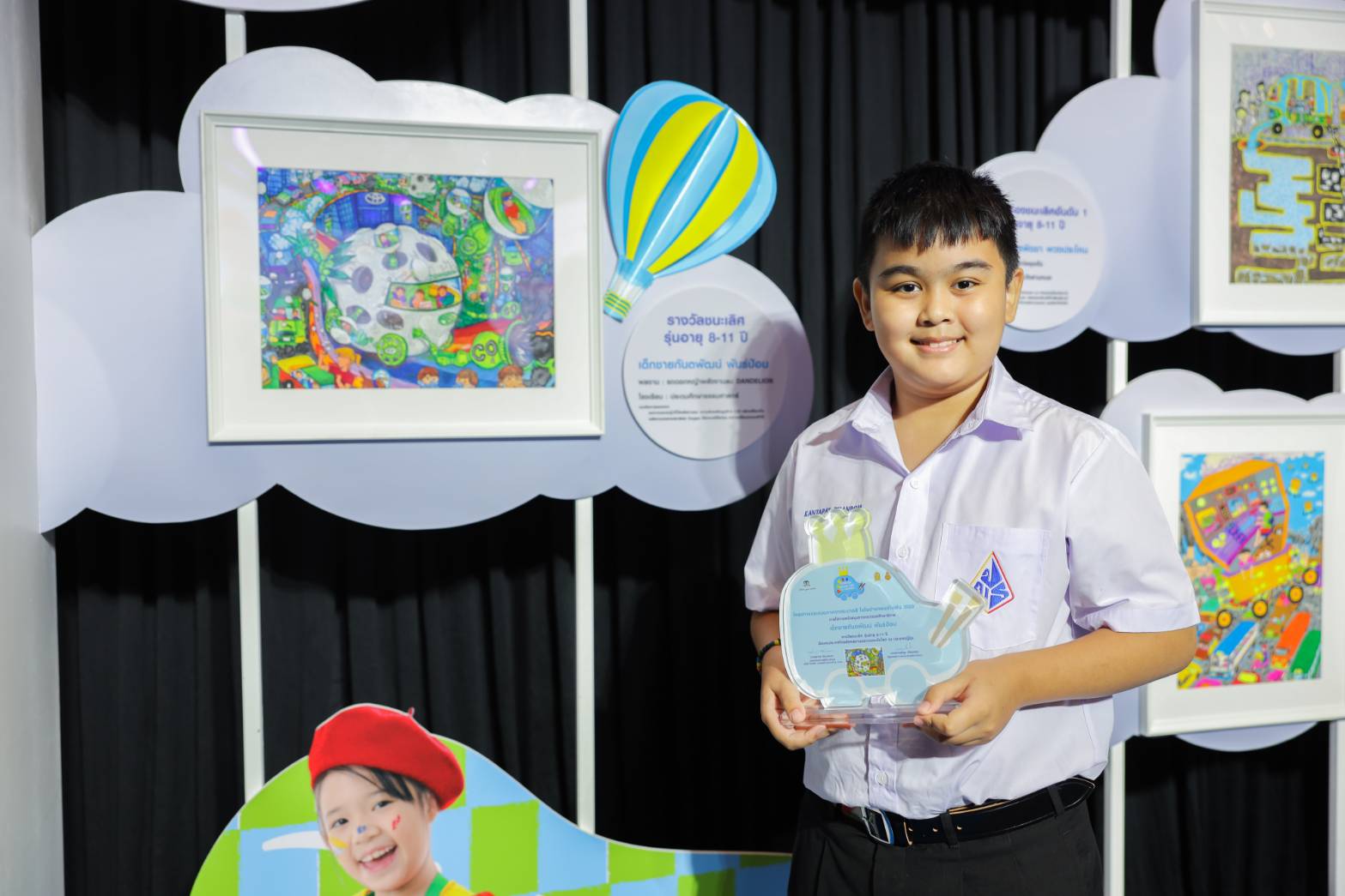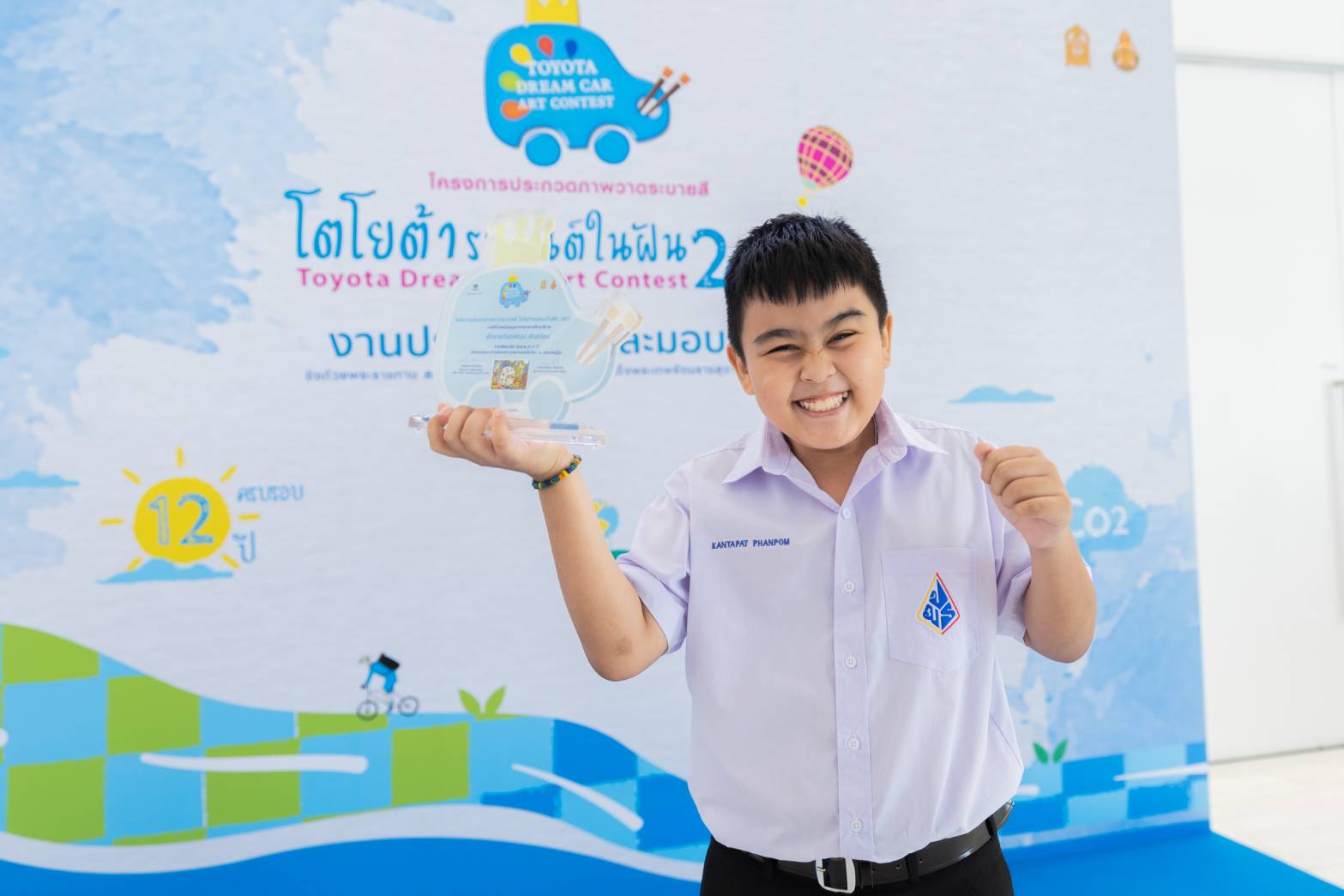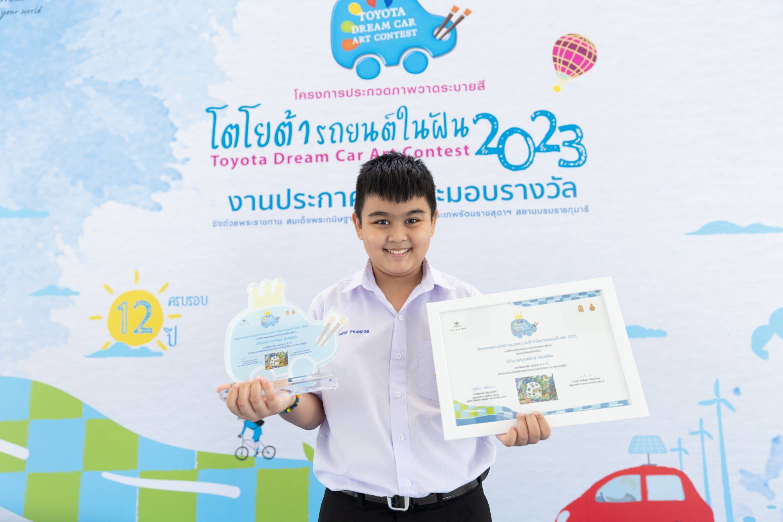 บริษัท โตโยต้า มอเตอร์ ประเทศไทย จำกัด ขอแสดงความยินดีกับ ด.ช. กันตพัฒน์ พันธ์ป้อม อายุ 10 ปี นักเรียนชั้นประถมศึกษาปีที่ 5 โรงเรียนประถมศึกษาธรรมศาสตร์ จ.ปทุมธานี ได้รับการคัดเลือกเป็น Best Finalist จากผลงาน “รถดอกหญ้าพลังงานลม DANDELION” ในการประกวดรอบสุดท้าย รุ่นอายุ 8 – 11 ปี โครงการ “Toyota Dream Car Art Contest” ครั้งที่ 16 ประจำปี 2566 จากจำนวน 782,852 ผลงาน 90 ประเทศทุกภูมิภาคทั่วโลก ภายใต้วัตถุประสงค์เพื่อเปิดโอกาสให้เด็ก และเยาวชนรุ่นใหม่ได้มีโอกาสแสดงออกทางความคิดสร้างสรรค์ และจินตนาการ ผ่านการใช้ศิลปะเป็นสื่อกลางในการวาดภาพระบายสี