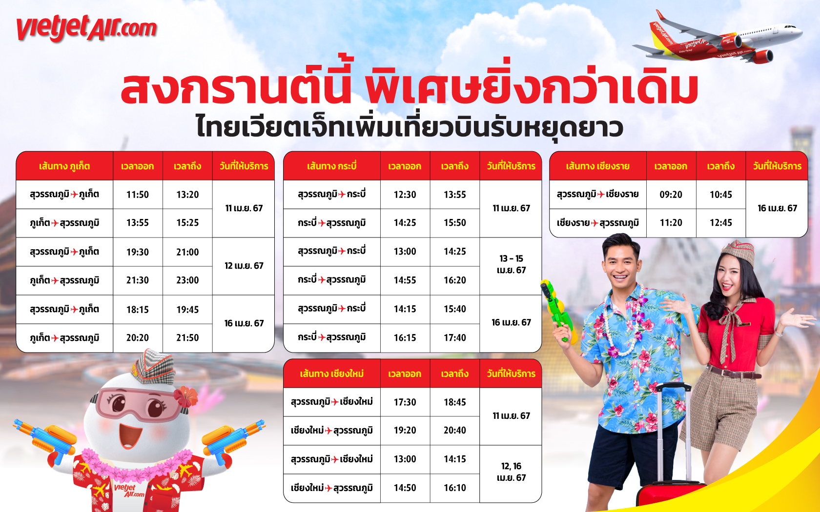 สายการบินไทยเวียตเจ็ทมุ่งมั่นมอบตัวเลือกการเดินทางที่ยืดหยุ่นแก่ผู้โดยสารในราคาที่เข้าถึงได้ พร้อมด้วยเครือข่ายเส้นทางบินที่ครอบคลุมทั่วทุกภูมิภาคของประเทศไทย รวมถึงการเชื่อมต่อที่ราบรื่นแก่ผู้โดยสารที่ต้องการเดินทางกลับภูมิลำเนาหรือท่องเที่ยวในช่วงวันหยุด เที่ยวบินเพิ่มเติมของไทยเวียตเจ็ทสำหรับการเดินทางในช่วงเทศกาลสงกรานต์ปี 2567 ประกอบด้วยเส้นทาง กรุงเทพฯ (สุวรรณภูมิ) สู่เชียงราย, เชียงใหม่, ภูเก็ต และ กระบี่ สายการบินไทยเวียตเจ็ทเชื่อมั่นว่าจำนวนเที่ยวบินที่เพิ่มขึ้นจะให้บริการผู้โดยสารที่ต้องการเดินทางกลับภูมิลำเนาหรือท่องเที่ยวในช่วงเทศกาลสงกรานต์ได้อย่างเพียงพอ ช่วยบรรเทาความหนาแน่นของการเดินทาง สอดรับกับความมุ่งมั่นของรัฐบาลที่จะอำนวยความสะดวกให้กับประชาชน