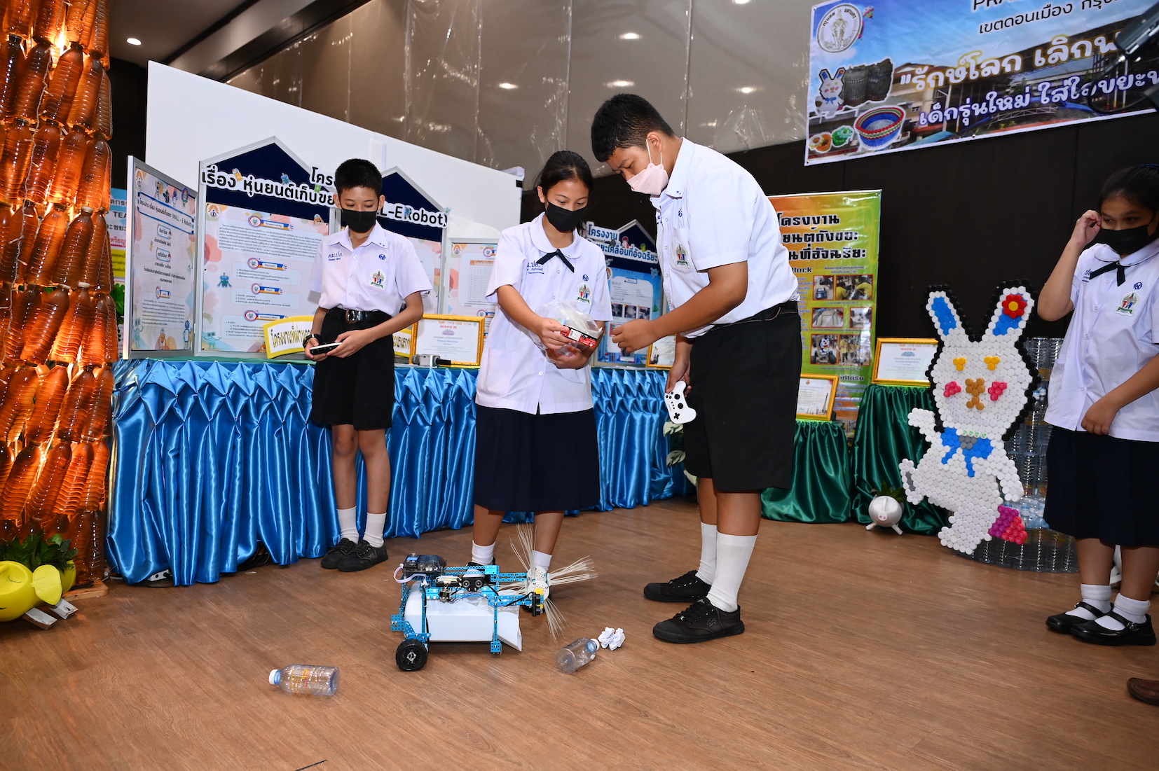 “ไฮไลท์ของโรงเรียนคือเครื่องบีบอัดขวดน้ำพลาสติกรุ่นที่ 3 อัพเดทล่าสุดจากโครงงานวิทยาศาสตร์ของโรงเรียน มีข้อดีคือสามารถบีบอัดขวดน้ำพลาสติกได้ทุกขนาดให้มีขนาดเล็กที่สุดเพื่อที่จะสามารถรวบรวมขยะขวดพลาสติกได้เยอะที่สุดโดยไม่เปลืองพื้นที่จัดเก็บก่อนขายซาเล้ง” น้องมีบุญ หรือ ด.ช.กิตติบุญ โฉมเฉิด นักเรียนชั้นประถมศึกษาปีที่ 6 จากโรงเรียนหัวหมาก อธิบายให้ฟังถึงนวัตกรรมการจัดการขยะรีไซเคิลและวิธีการบริหารจัดการขยะภายในโรงเรียน ส่วนน้องซี หรือ ด.ญ. นันทิชา รอดคง นักเรียนชั้นประถมศึกษาปีที่ 6 จากโรงเรียนวัดพระยาปลา บอกว่า “สำหรับโรงเรียนของหนูส่วนมากเป็นการนำขวดพลาสติกมาทำประโยชน์อย่างอื่นที่ไม่ใช่การทิ้ง หรือการเผา เช่น การทำเป็นเก้าอี้จากขวดพลาสติก แล้วใส่ผ้าคลุมให้สวยงาม ก็ใช้ประโยชน์ต่อได้